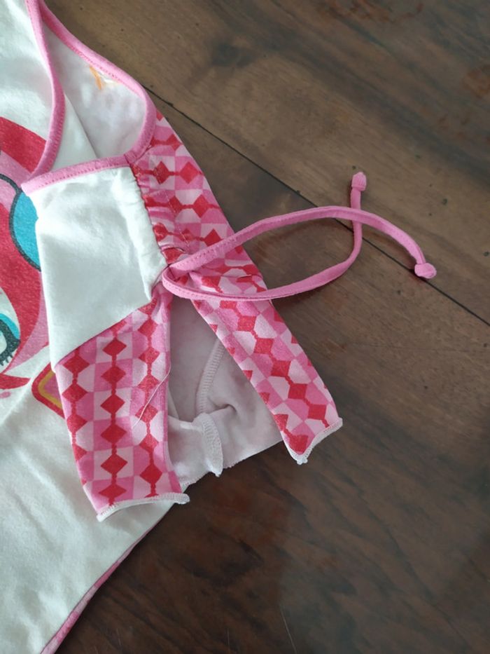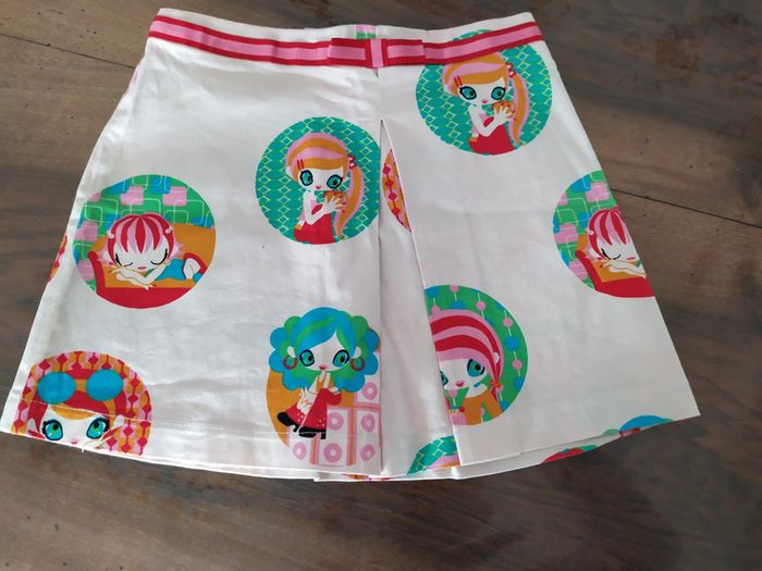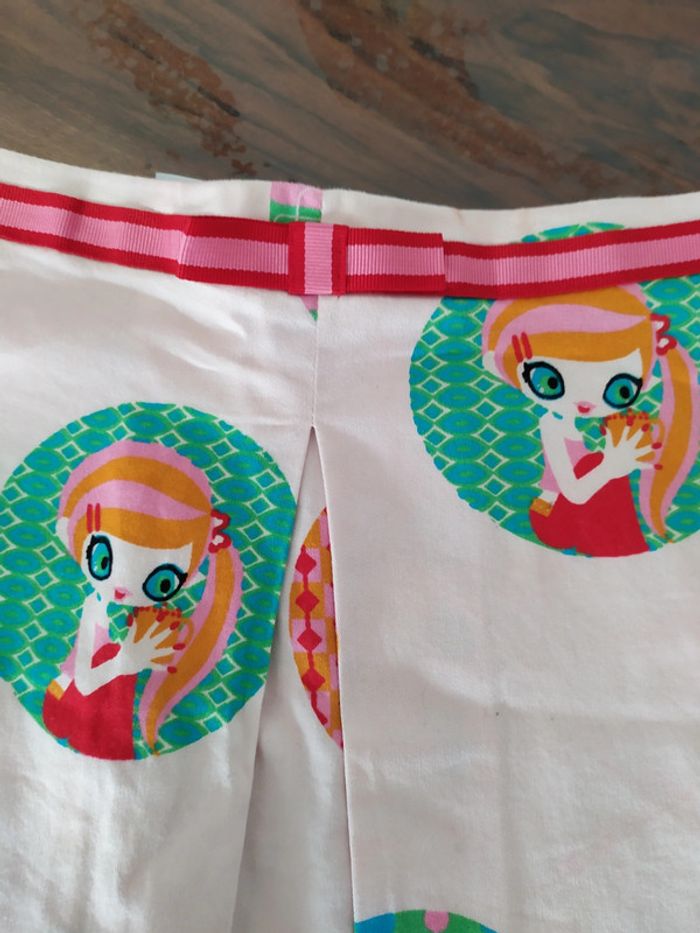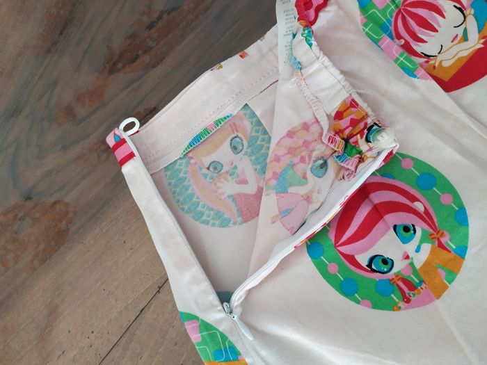 ✔Jupe courte rose ( presque blanche) avec des motifs petite fille dans diverses positions. Taille élastique dans le dos, ouverture sur le côté gauche par un bouton et une fermeture zippée cachée. Joli pli devant.