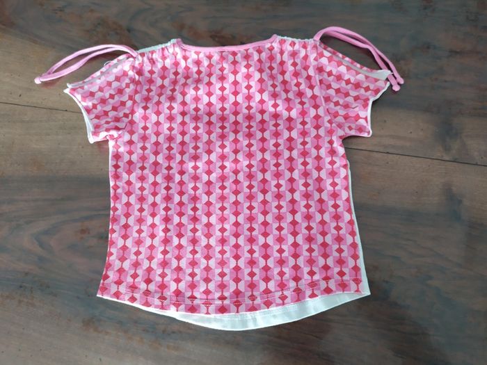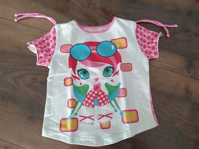 ✔T.shirt à manches courtes blanc, motifs fillette avec une grosse paire de lunettes. Manches courtes ouvertes sur le dessus + 2 liens... Épaules resserrées par maille élastique. Dos composé d'un quadrillage à motifs dans les tons roses.