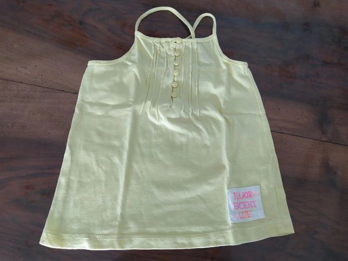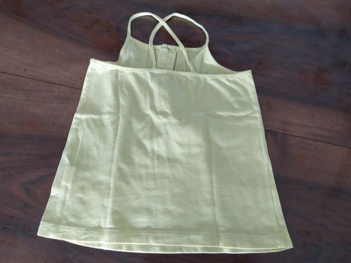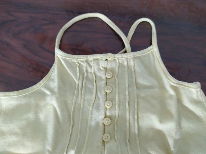 Joli débardeur jaune pâle à fines bretelles qui se croisent dans le dos. Peut s'ouvrir sur le devant par 6 petits boutons. Un carré motif écritures cousus en bas à gauche. Taille : 5 ans Marque : Tex Composition : 100% coton Débardeur en excellent état. #nerimafille5ans #tex