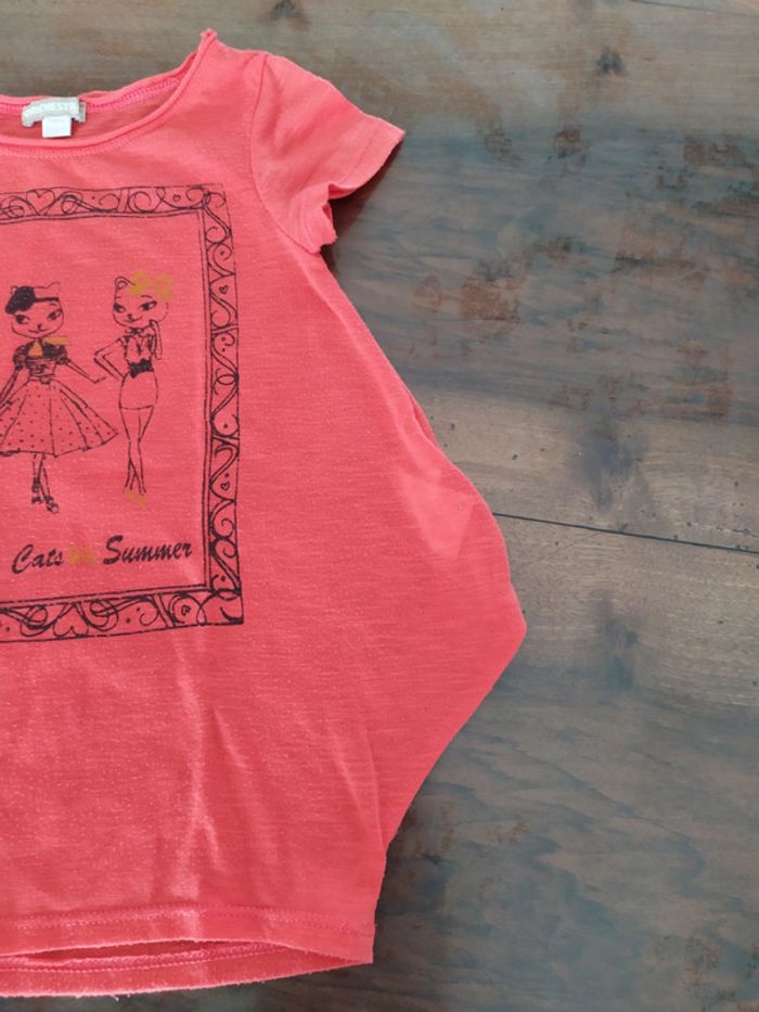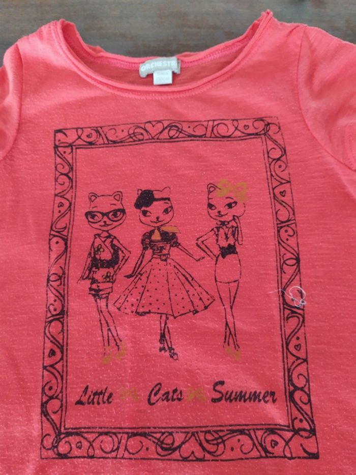 Joli t.shirt orange avec un motif tableau devant représentant 3 chattes top modèle. Coupe très élargie sur les côtés mais resserré dans le bas. Taille : 5 ans Marque : Orchestra Composition : 72% polyester 25% viscose 3% élasthanne. T.shirt beaucoup porté qui est cependant en très bon état. #nerimafille5ans #orchestra