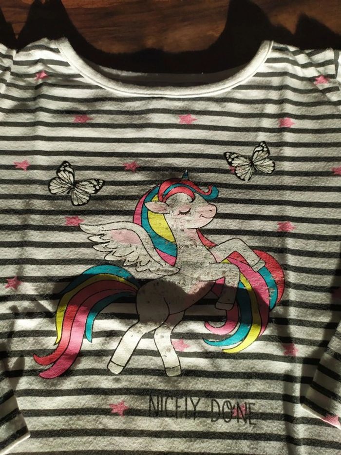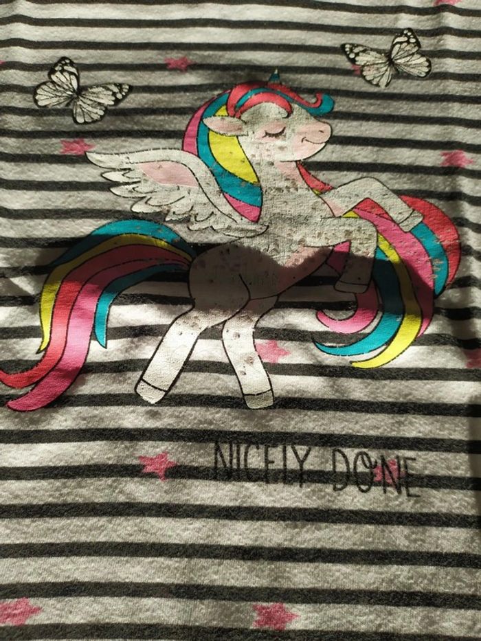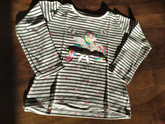 Joli t.shirt blanc à rayures noires + étoiles roses. Motif Licorne et papillons. 🚫 Le motif commence à craqueler. Marque : U essentiel Taille : 5 ans Composition : 100% coton T.shirt en très bon état #nerimafille5ans #uessentiel #nerimaarticleavecdefaut
