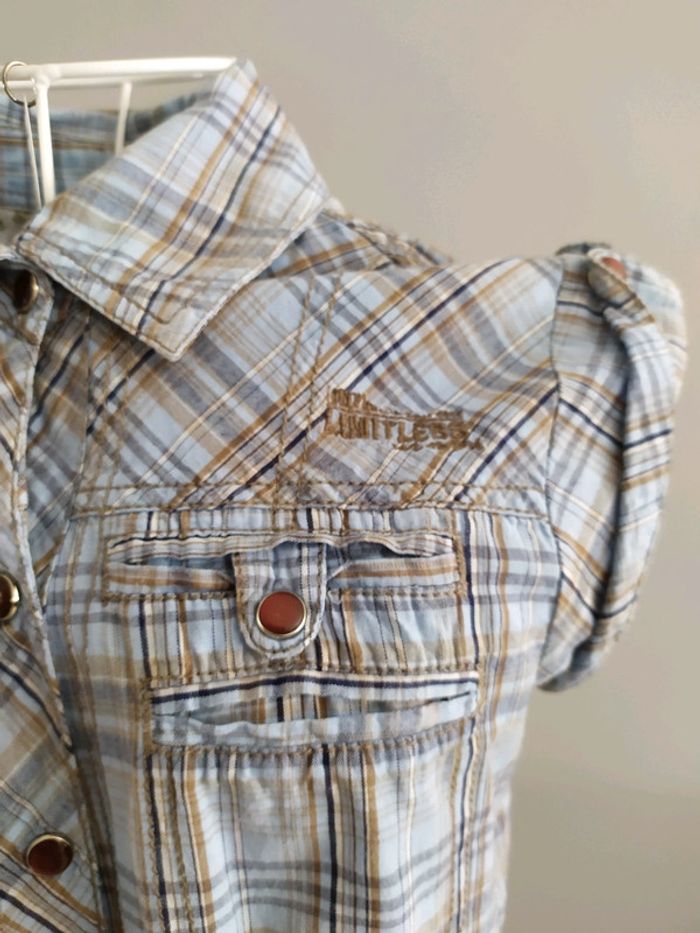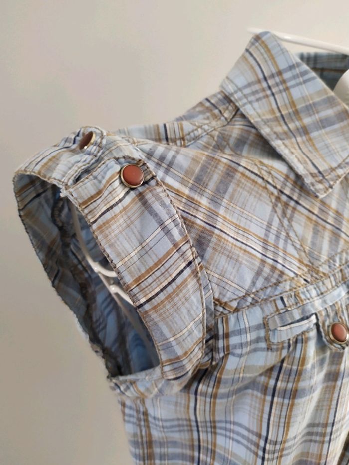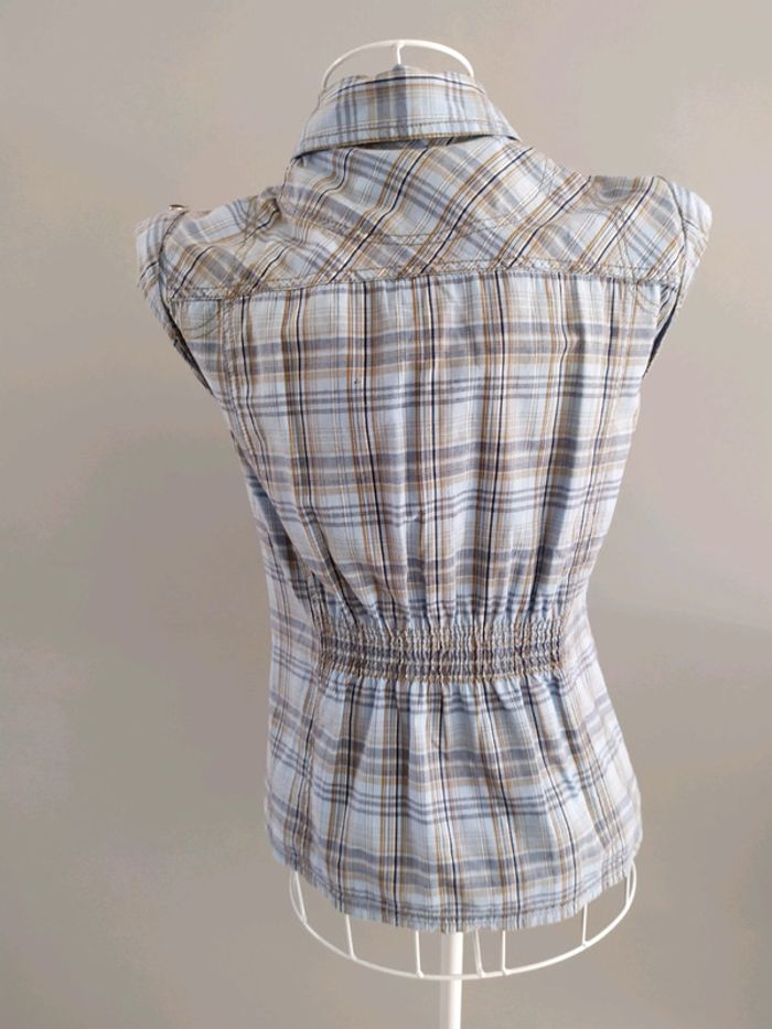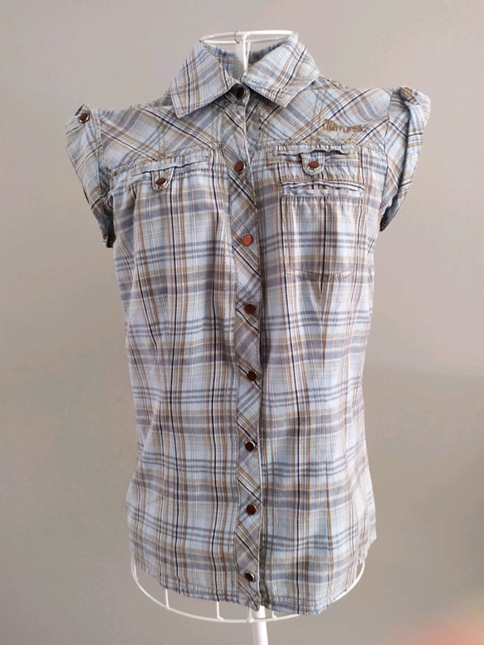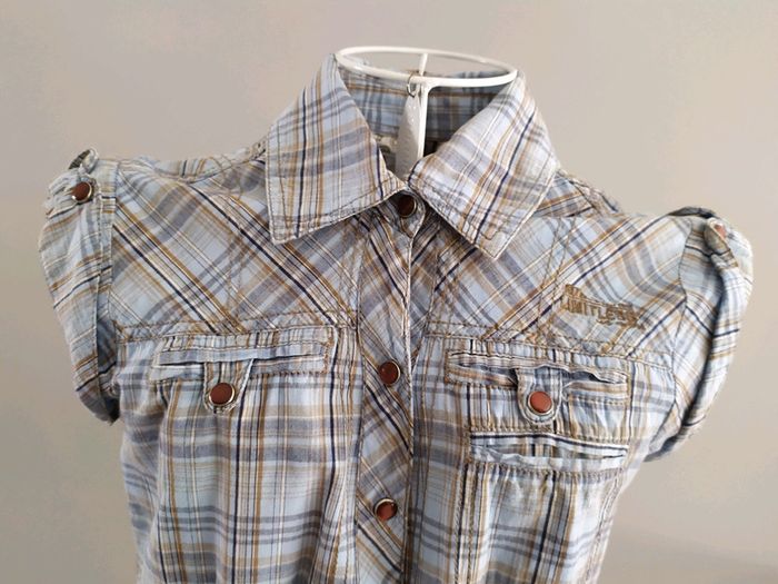 Magnifique chemise sans manches couleur bleue clair à carreaux ( effet jean). Fermeture par boutons pression déco qui se retrouvent aussi aux dessus des manches et aux fausses poches poitrine. Chemise ceintrée dans le dos par élastique. Taille S mais convient mieux pour un XS, où petit S Composition : 100% coton. Chemise en excellent état, comme neuve. #nerimafemme34 #nerimafemme36 #only