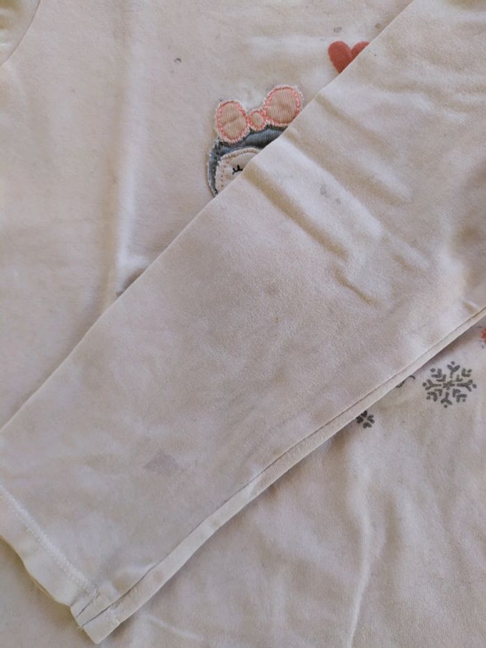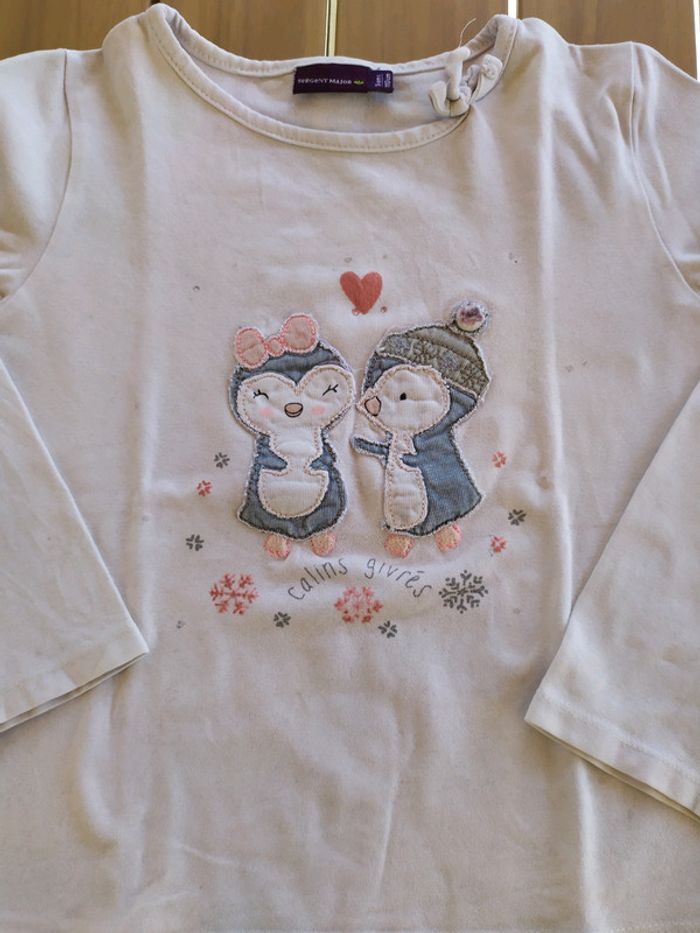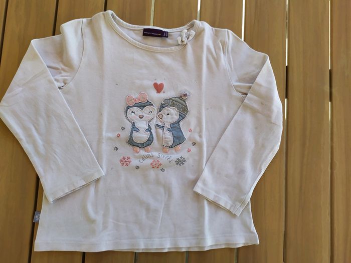 Joli t.shirt blanc à manches longues. Motif pingouin cousus dessus. Un petit noeud au col. Petites tâches à l'arrière de la manche gauche ( cf dernière photo📷). Taille 5 ans #nerimafille5ans #sergentmajor