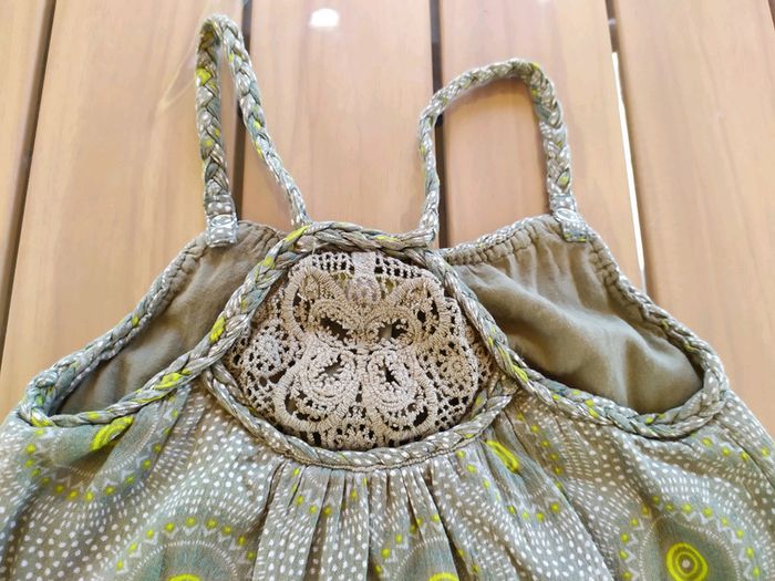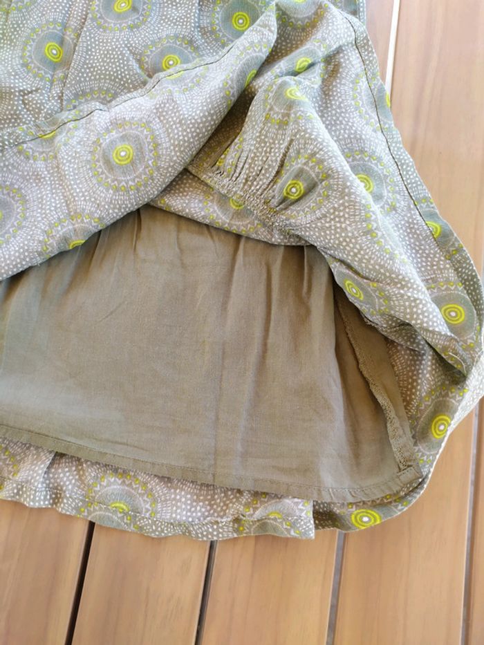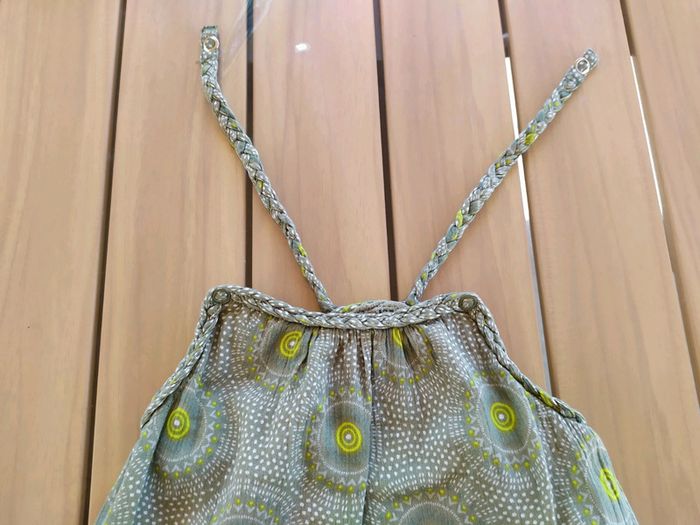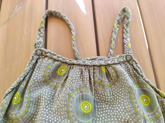 Magnifique robe légère kaki à fines bretelles tressées. Les bretelles peuvent s'ouvrir par boutons pression. Joli décoration en haut du dos en tissus brodé. Robe doublée sur toute la longueur. Taille 5 ans Longueur : 65 cm. Composition : 100% coton Robe en excellent état ( peu portée). #nerimafille5ans #vertbaudet