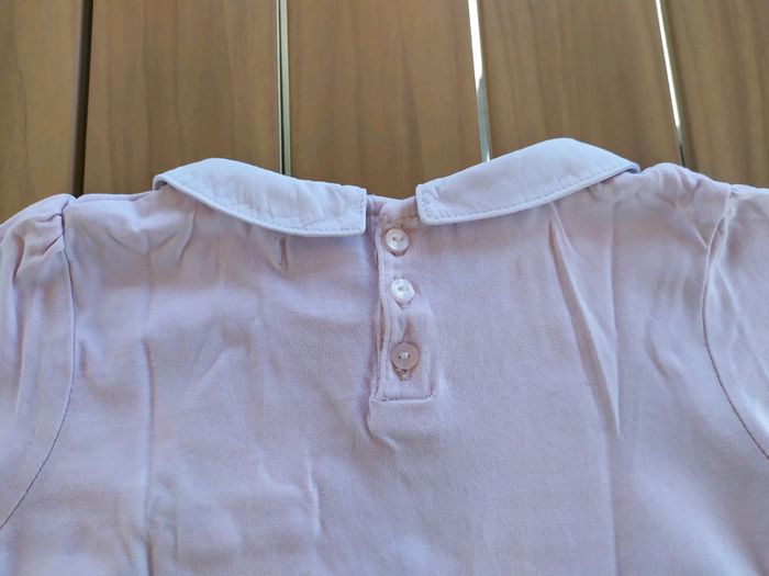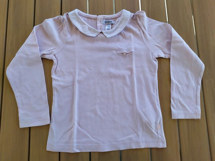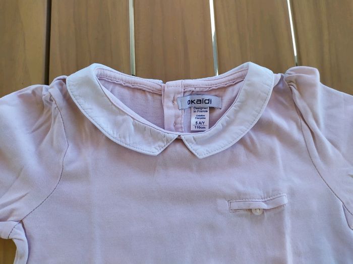 Joli t.shirt à manches longues rose pâle. Joli Col blanc. Ouverture dans le dos par 3 boutons. Petite poche boutonnée sur la poitrine gauche. Taille 5 ans. Composition : 100% coton. T.shirt en excellent état. #nerimafille5ans #okaidi