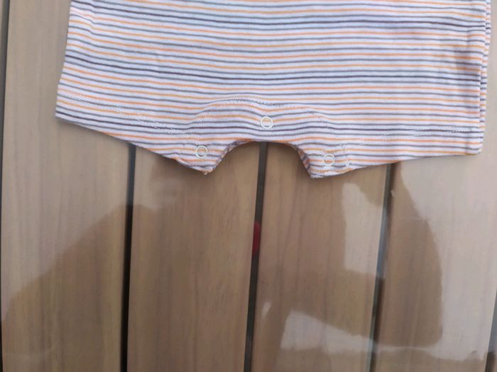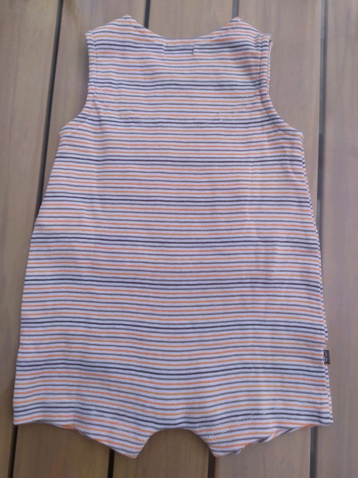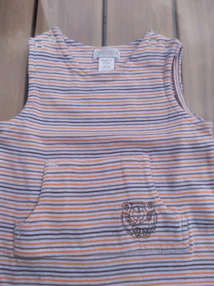 Adorable combishort sans manches à fines rayures oranges/marrons/écrus. Ouverture par boutons pression au niveau des épaules. Ouverture totale à l'entre jambes par boutons pression. Une poche "passe mains" Ventrale. Taille 1 mois. Composition : 100% coton Combishort neuf, porté une fois. #nerimagarcon1mois #obaibi