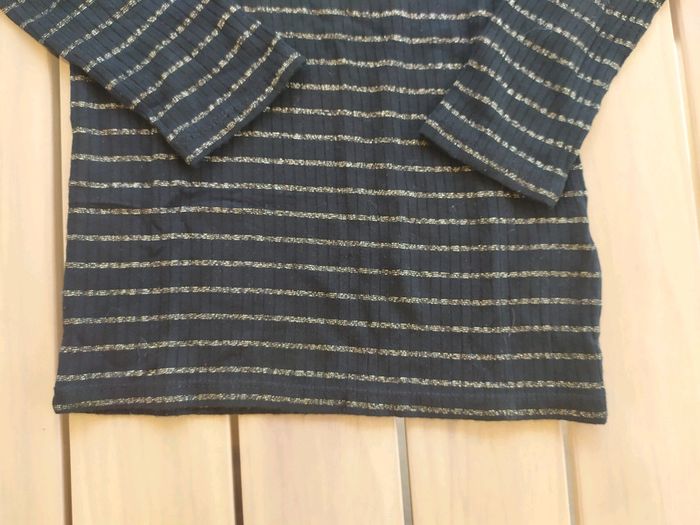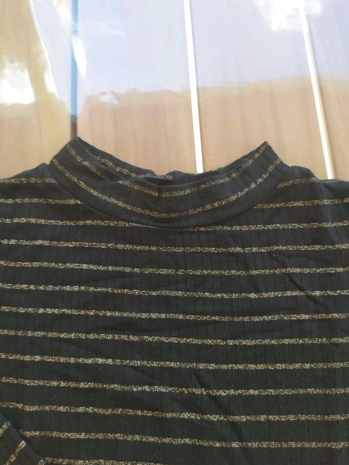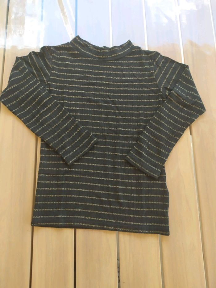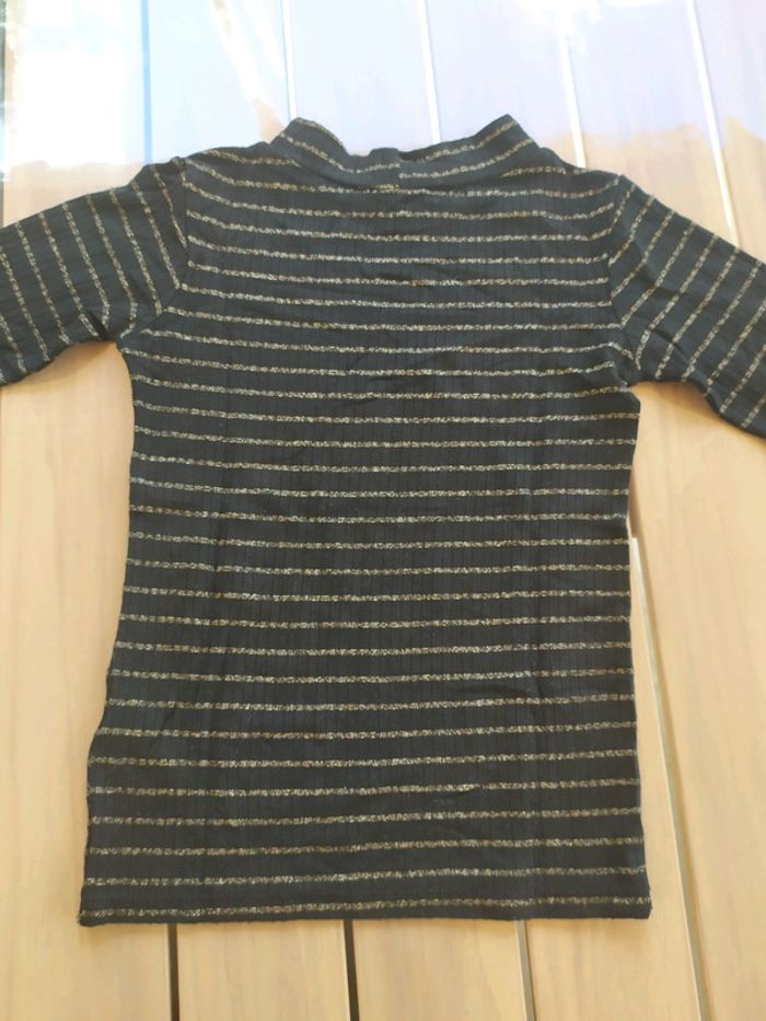 Joli t. shirt noir rayé doré à manches longues léger, col montant. Taille 4 ans. Composition : 91% viscose 5% fibres métalliques 4% élasthanne. T.shirt en excellent état, peu porté. #nerimafille4ans #gemo