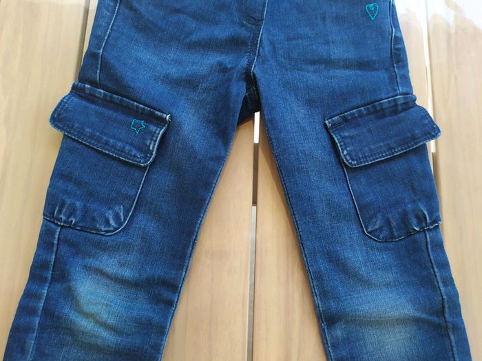 Joli jean bleu marine épais. Taille élastique réglable à l'intérieur + 1 bouton pression. 2 poches devant + 2 poches à rabat sur les jambes + 2 poches arrière. Motifs bleu clair brodés au niveau des poches devant. Passants pour ceinture.