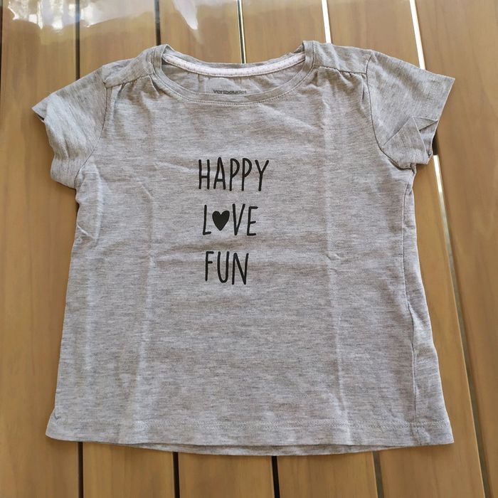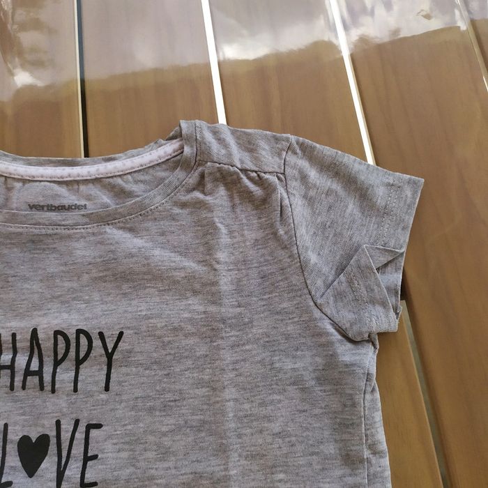 T.shirt gris, manches courtes, écritures noires. Taille 4 ans Composition : 95% coton 5% viscose T.shirt en très bon état. #nerimafille4ans #vertbaudet