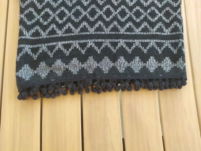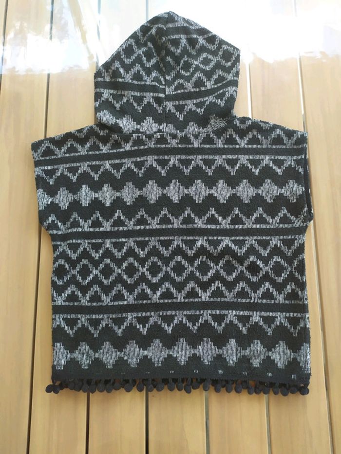 Joli pull sans manches à capuche fixe noir et blanc. Pompons noirs dans le bas. Taille 4 ans Composition : 46% polyester 35% coton 17% viscose 2% élasthanne. Pull en excellent état, comme neuf. #nerimafille4ans #gemo