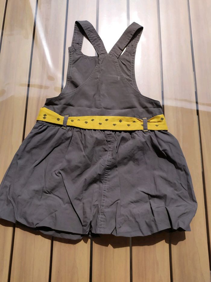 Robe salopette boule anthracite, décorations jaunes. Une ceinture en tissus jaune moutarde, fixée derrière. Bretelles réglables sur 2 longueurs. Boutons pression sur les côtés. 2 fausses poches devant.