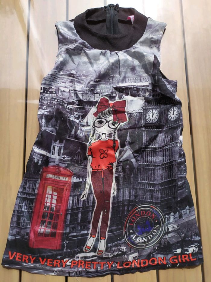 Robe noire à col légèrement montant, sans manches, doublée. Motif jeune fille à Londres 🇬🇧. Ouverture zippée dans le dos. composition du tissu avec motifs : 100% polyester Composition de la robe : 85% polyester 10% viscose 5% élasthanne. Taille 3 ans Robe en très bon état. #nerimafille3ans #gemo