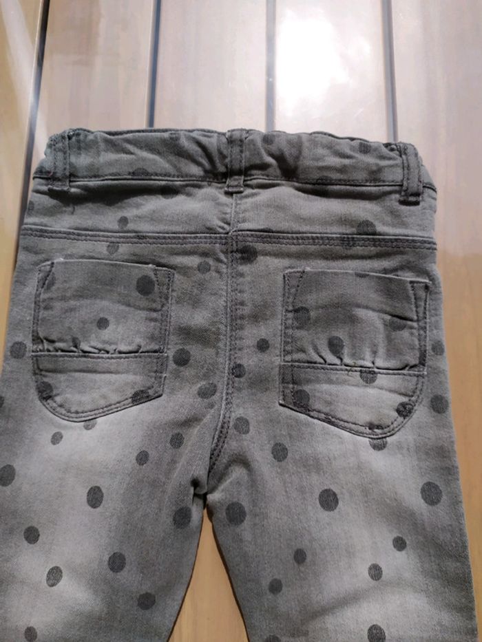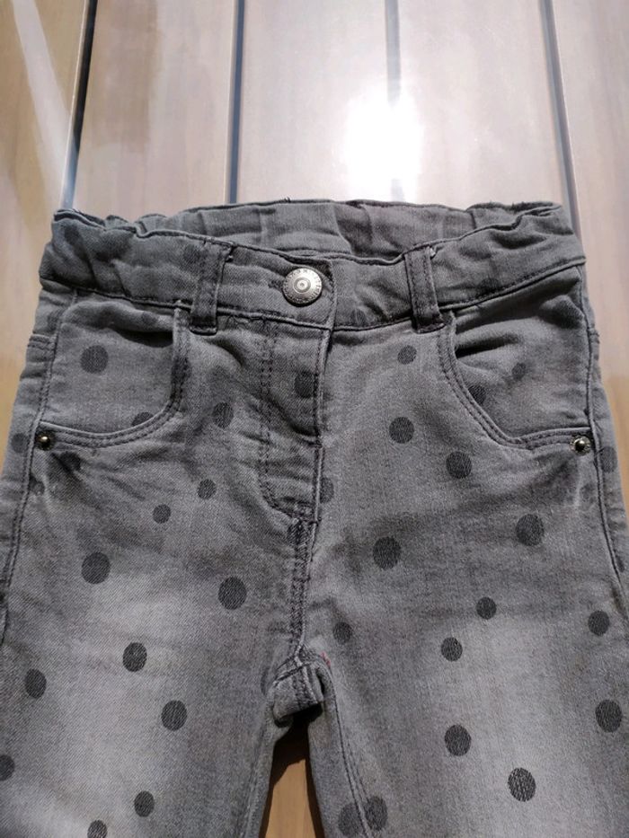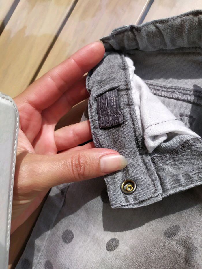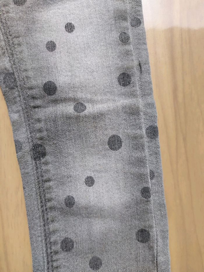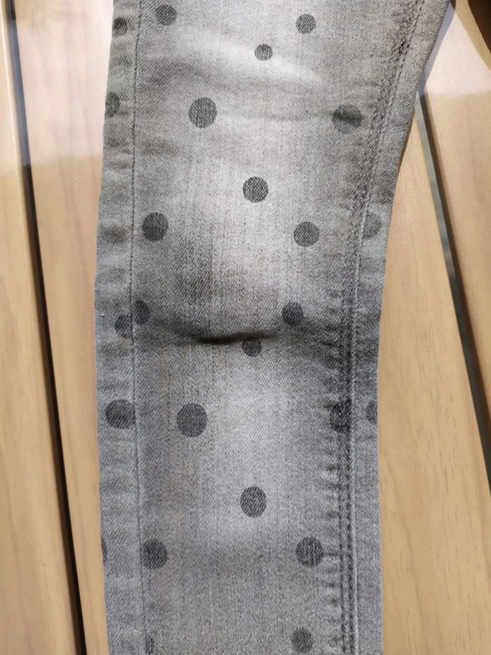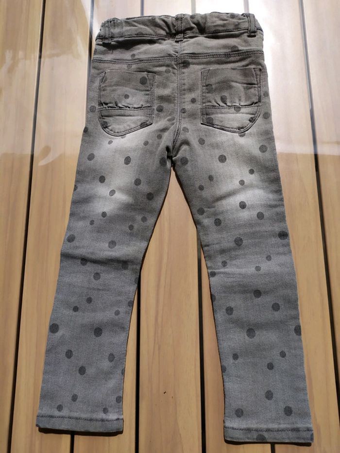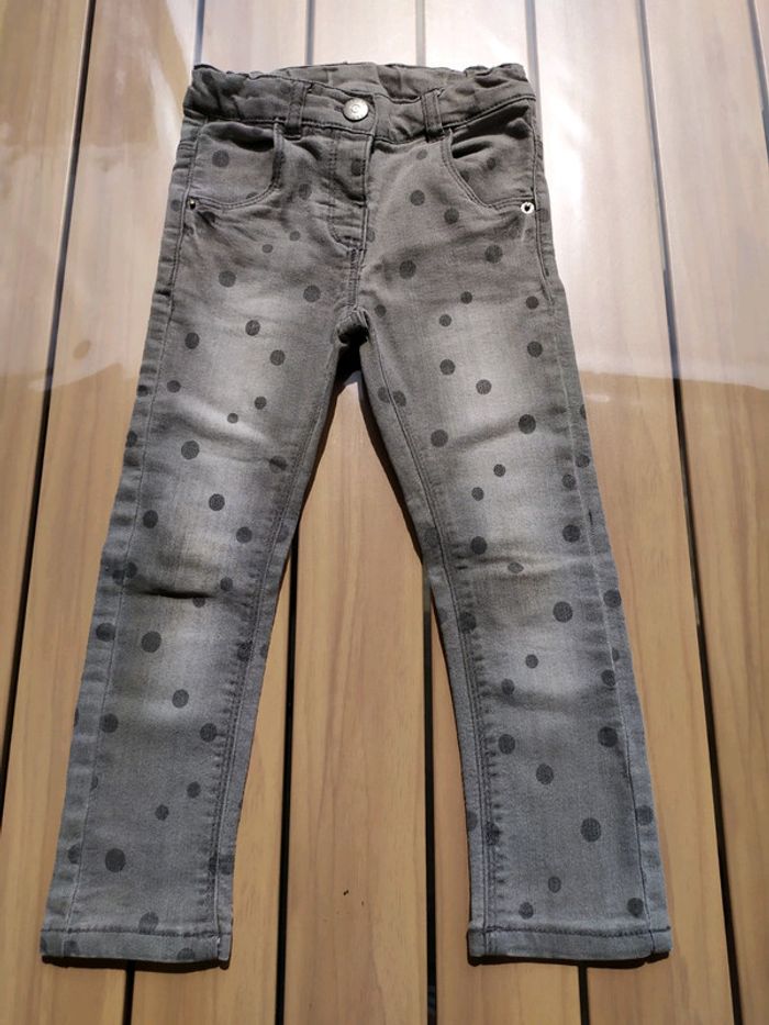 Joli jean gris à pois. Fermeture par un bouton pression, réglable à l'intérieur. Passants pour ceinture. 2 poches devant et derrière. Traces au niveau des genoux qui se confondent dans la couleur. Taille 3 ans #nerimafille3ans #kiabi
