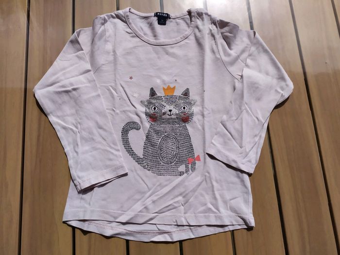 T.shirt à manches longues, rose très pâle ( presque blanc). Motif chat🐈 avec de grosses lunettes et une couronne. Taille 3 ans Composition : 100% coton T.shirt en très bon état #nerimafille3ans #kiabi