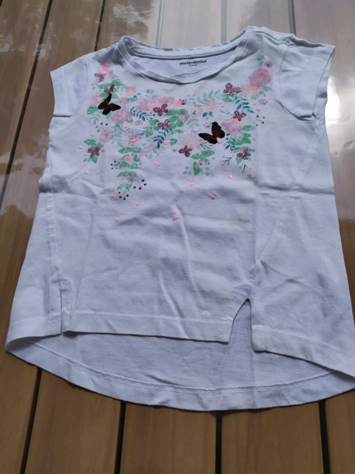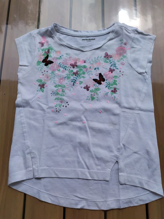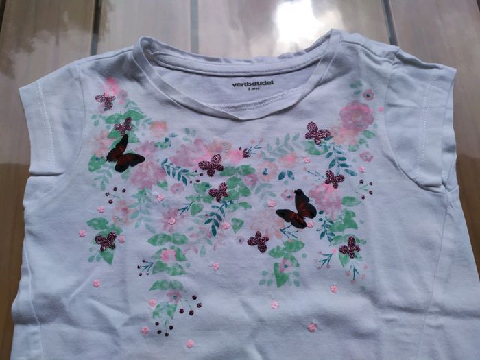 T.shirt blanc à manches courtes, motifs papillons. Fentes devant. Taille 3 ans Composition : 100% coton T.shirt en excellent état #nerimafille3ans #verbaudet