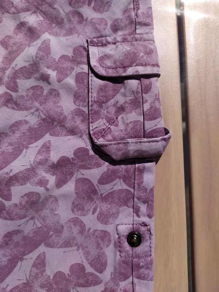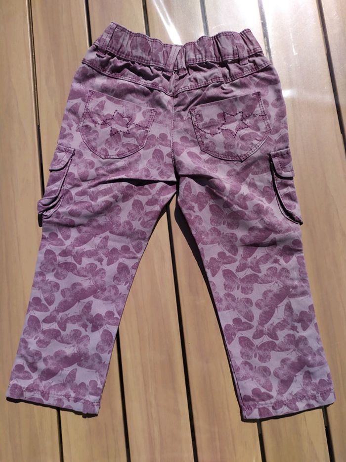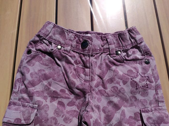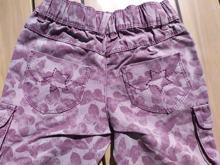 Joli pantalon violet à motifs papillons. Taille élastique + 1 bouton pression, réglable à l'intérieur. 2 poches devant + 2 poches sur les jambes qui ferment par scratch + 2 poches arrière. Les jambes peuvent se retrousser pour former un pantacourt. Taille 2 ans (86 cm). Composition : 48% coton 43% polyester 9% polyamide. Pantalon en très bon état. #nerimafille2ans #vertbaudet