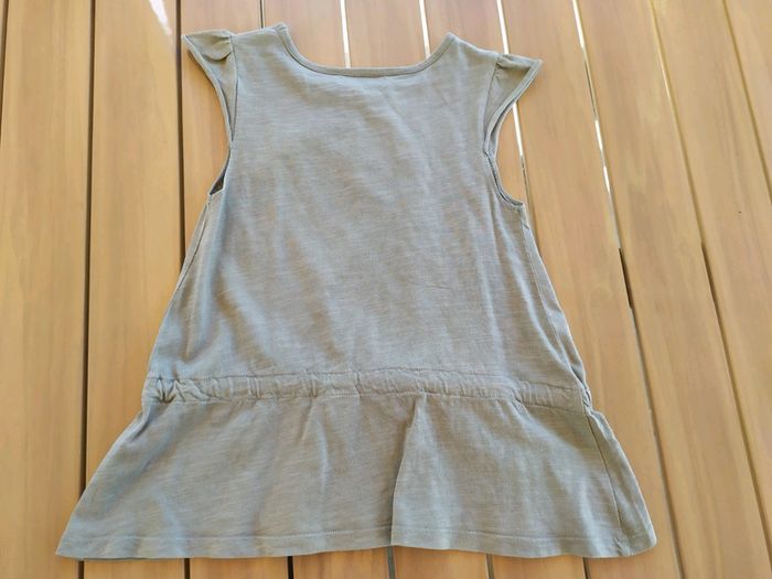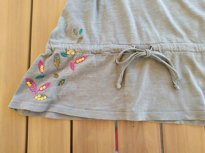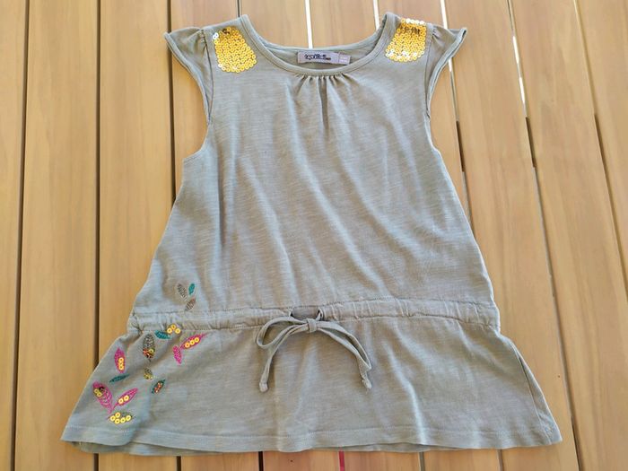 Jolie tunique kaki à manches courtes. Décoration sequins dorés sur les épaules. Broderies + sequins en bas à droite. Lien de serrage intégré à la taille. Taille 5 ans Longueur : 42 cm Tunique en excellent état. #nerimafille5ans #tapealoeil