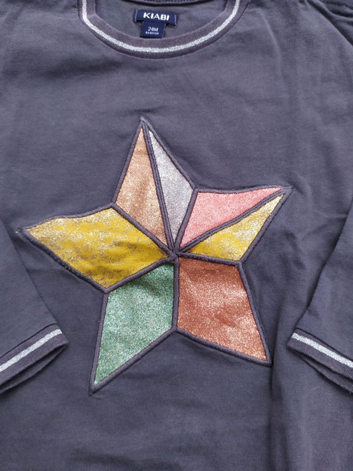 Joli t.shirt à manches longues anthracite, taille 24 mois (83-89 cm). Ouverture par boutons sur chaque épaule. Motif étoile multicolore brillante. Bas du t.shirt resserré par élastique. Un petit trou au bout de la manche droite ( cf dernière photo📷), sinon le t. shirt est en très bon état. #nerimafille2ans #kiabi