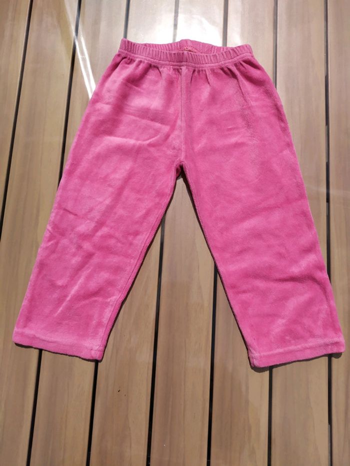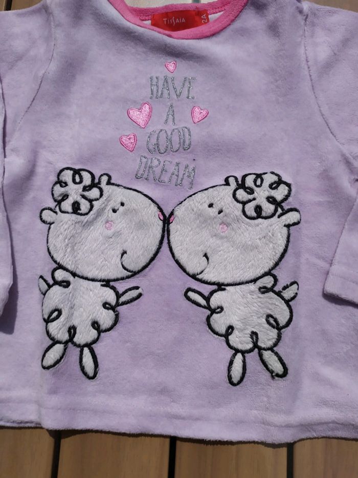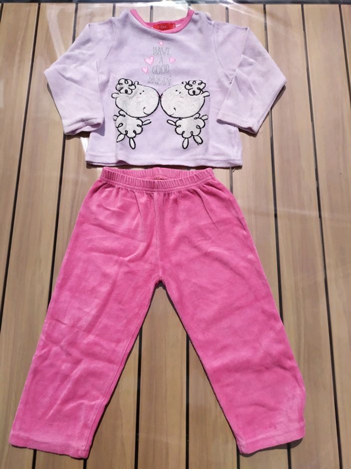 Joli pyjama 2 pièces en velours, taille 2 ans. Rose clair et fushia, motif moutons🐑en fausse fourrure. Tâches sur le haut du pyjama dues à un transfert de couleurs pendant le lavage. #nerimafille2ans #tissaia