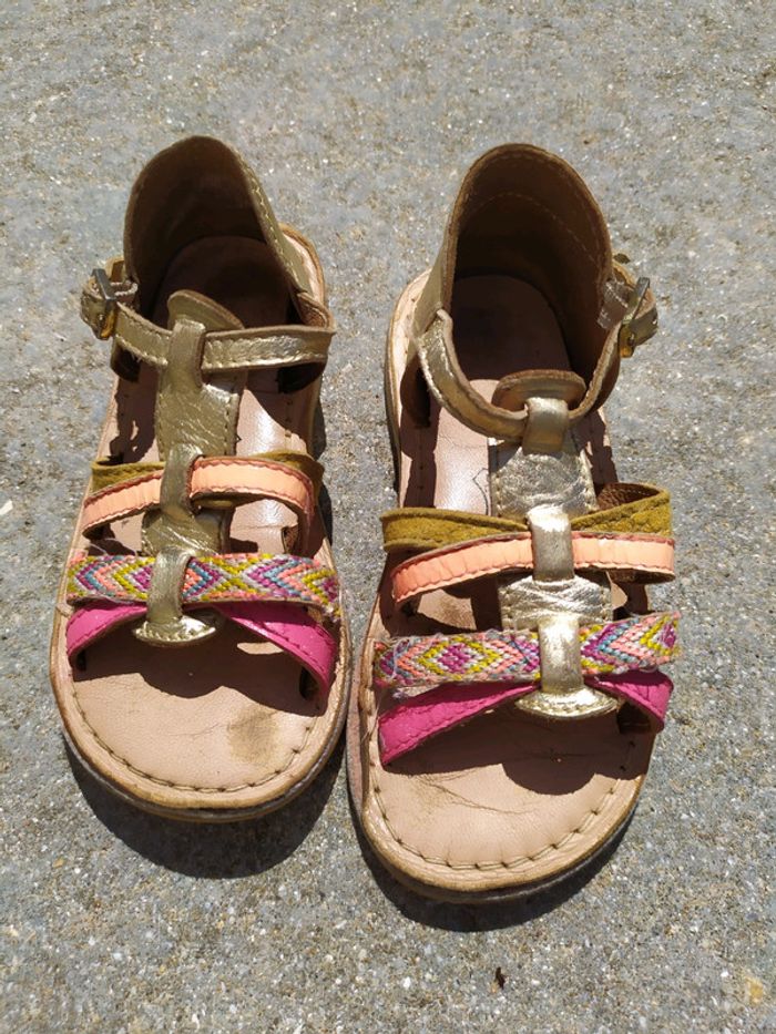 Jolies sandalettes dorée et marron. Fermeture par boucle. Cuir et semelles intérieures cuir. Le cuir se décolle à la semelle au niveau des coutures. Les semelles sont un peu usées. Pointure 24 Sandalettes en bon état. #nerimachaussuresenfants