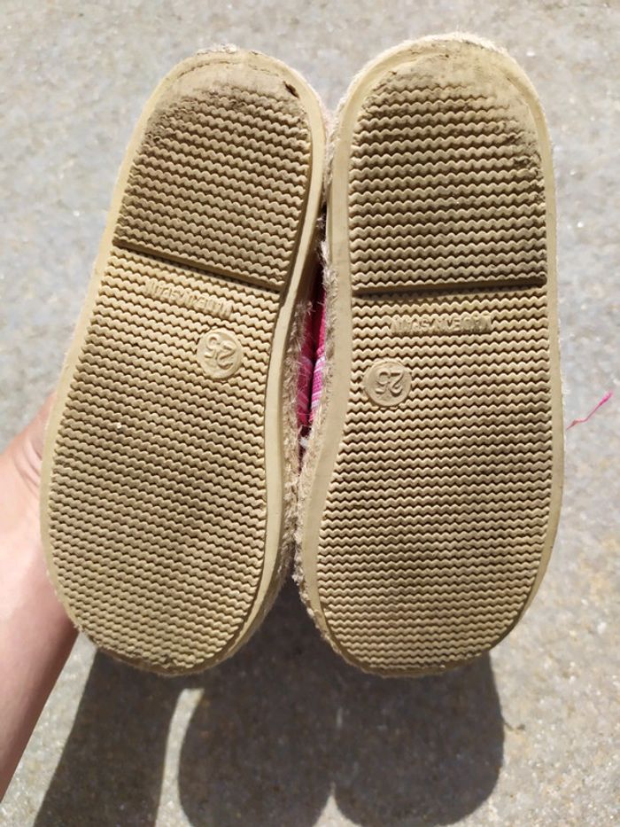 Jolies espadrilles roses. Élastique sur le dessus qui permet un meilleur maintient de la chaussure☺. Semelles épaisses et rigides. Pointure 25. Espadrilles en très bon état. #nerimachaussuresenfants