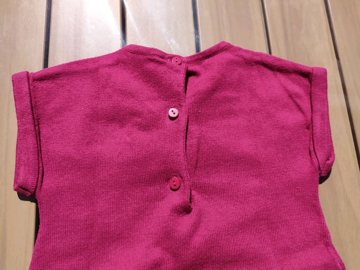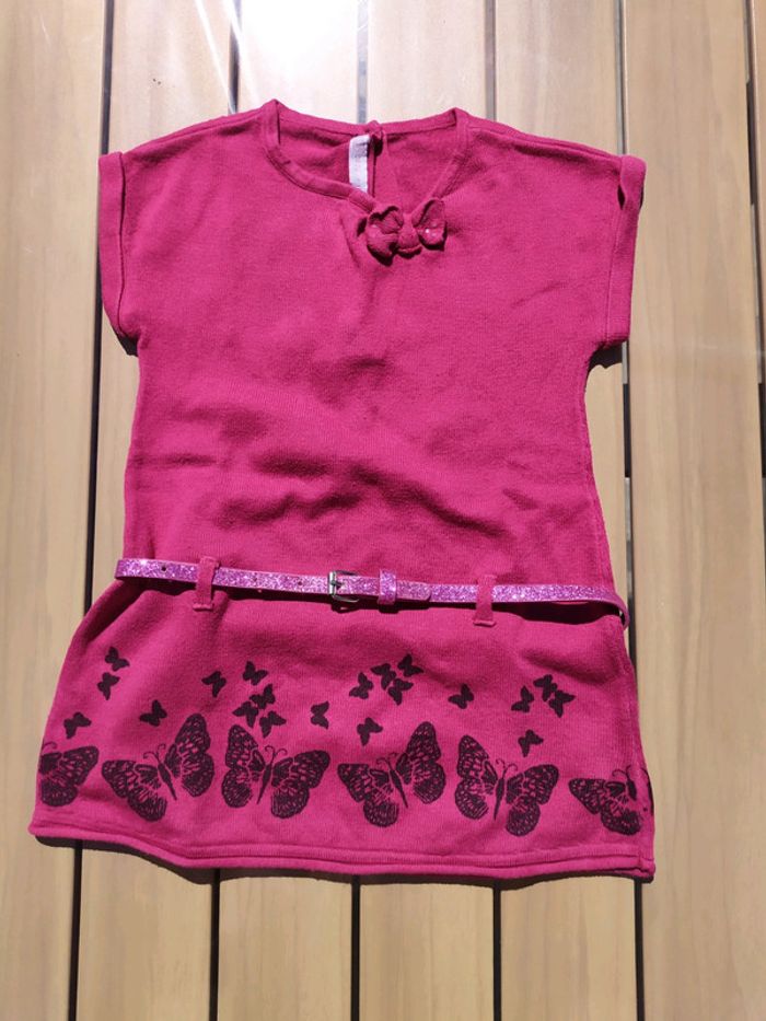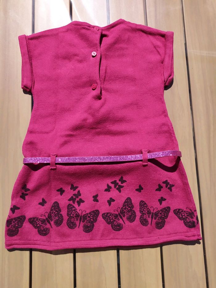 Très jolie robe rose à manches courtes. Gémo, taille 18 mois. Noeud au niveau du col, motifs papillons noir en bas de la robe. Passants pour ceinture + ceinture rose pailleté. Revers au bout des manches. Ouverture dans le dos par boutons. Composition : 78% coton 22% polyamide Robe en excellent état. #nerimafille18mois #gemo
