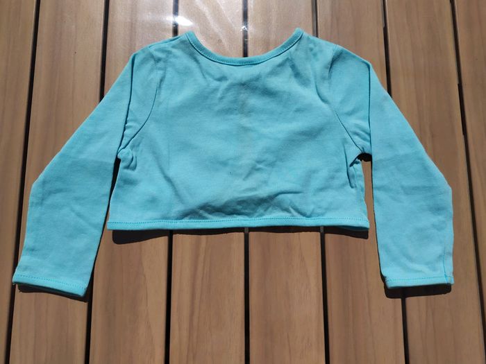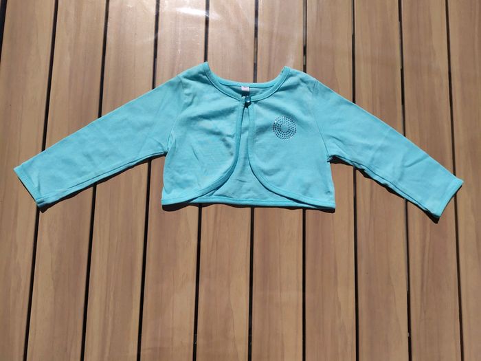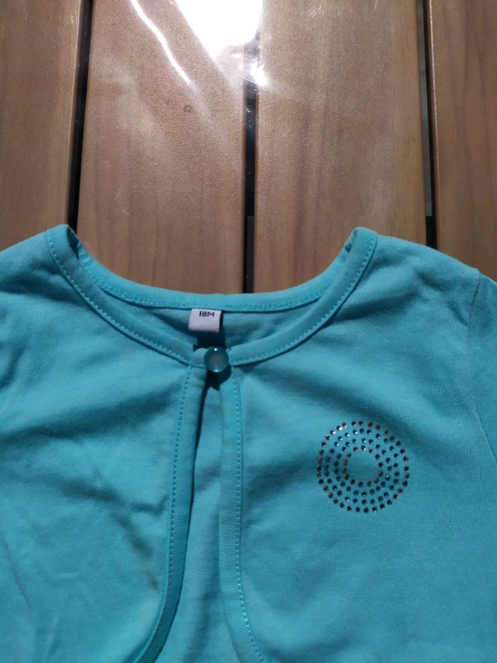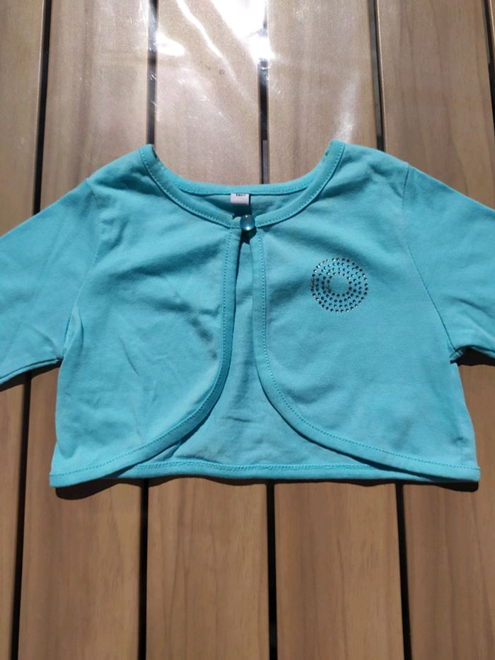 Joli Boléro bleu turquoise. Taille 18 mois. Fermeture par un bouton. Jolie décoration strass argenté et bleu sur la poitrine gauche. Quelques petites tâches au bout de la manche droite ( cf photo📷 5). Composition : 60% coton 40% polyester. Boléro en très bon état. #nerimafille18mois