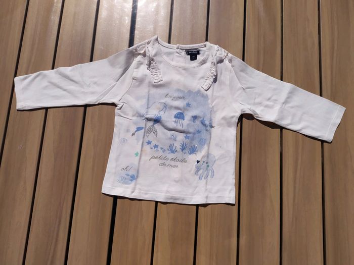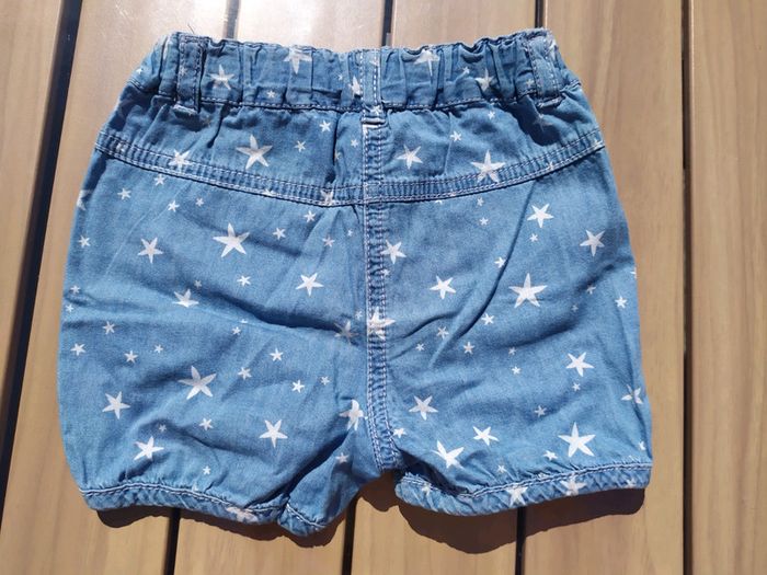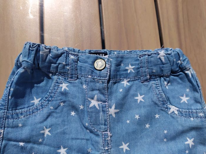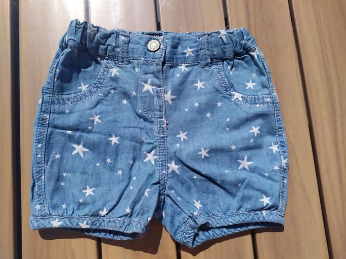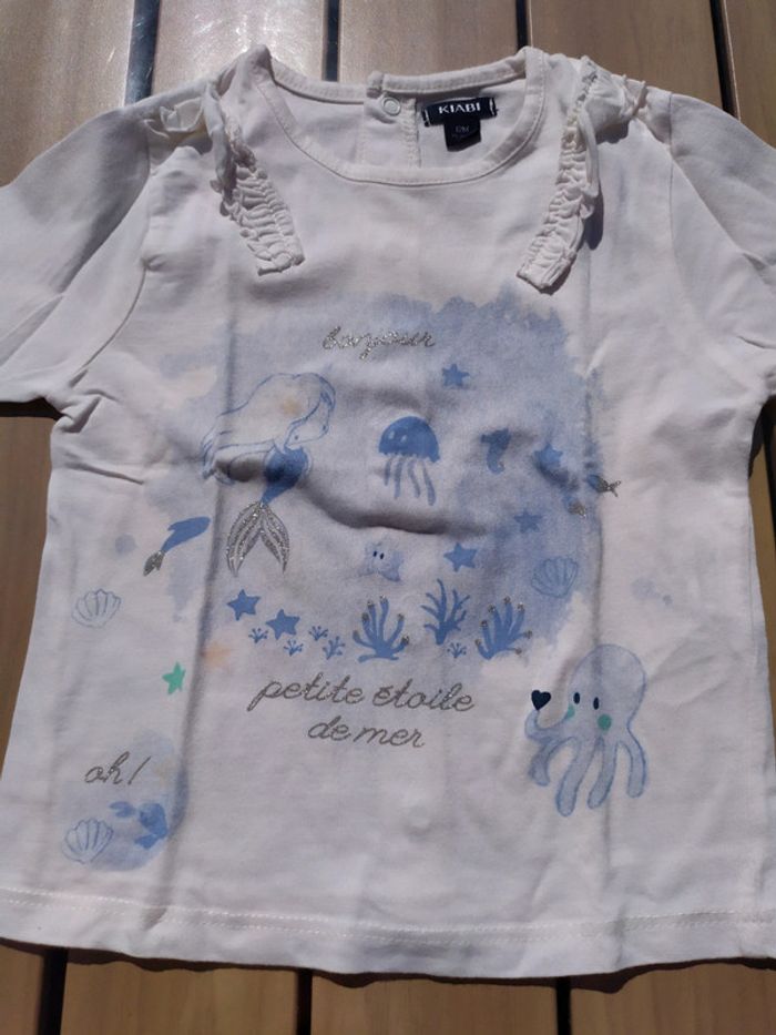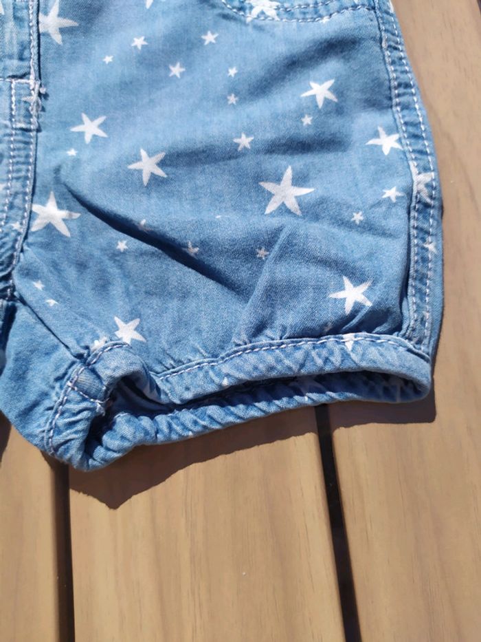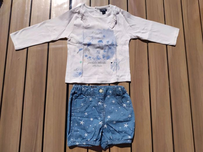 Ensemble 2 pièces bleu clair et blanc. Kiabi, taille 12 mois. ✔short en jean léger bleu clair à motifs étoiles. Taille élastique réglable à l'intérieur + 1 bouton pression. 2 poches devant. Resserré au niveau du bout des jambes. ✔t.shirt à manches longues blanc à motifs marins. Jolies décorations qui partent des épaules. Ouverture dans le dos sur toute la longueur par boutons pression. Composition : 100% coton. Ensemble en excellent état, comme neuf. #nerimafille12mois #kiabi