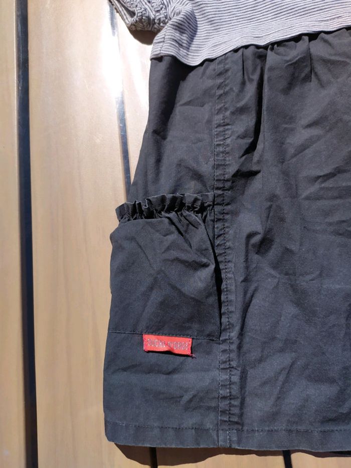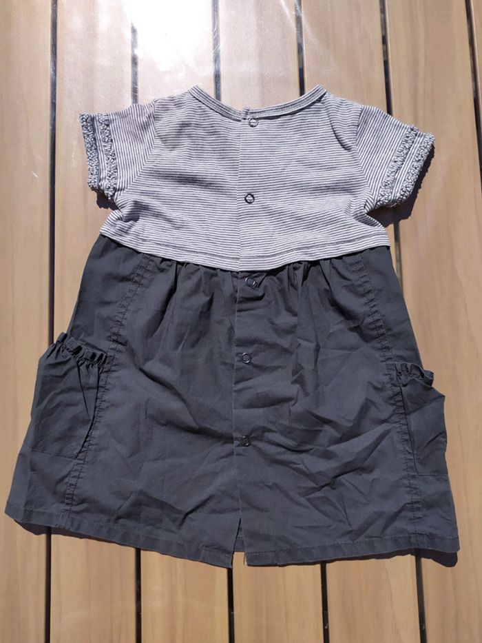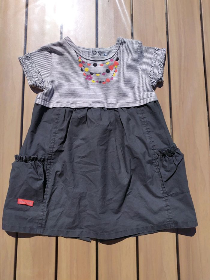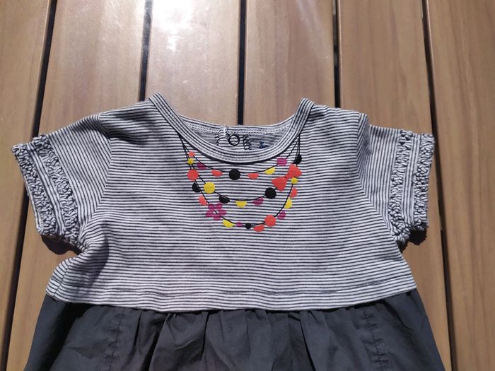 Robe dans les tons gris à manches courtes. Suvre d'orge, taille 9 mois. Décorations cousues sur les manches, 2 petites poches devant. Ouverture totale dans le dos. Composition : 100% coton Excellent état, très peu portée. #nerimafille9mois #sucredorge