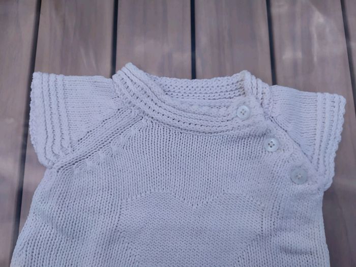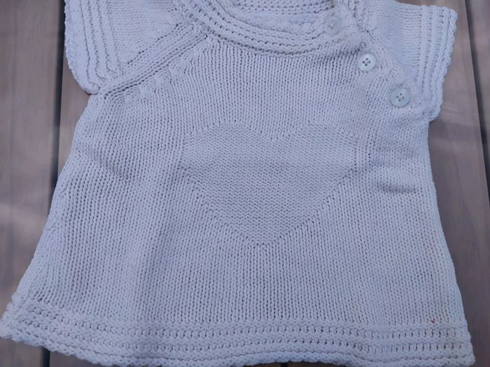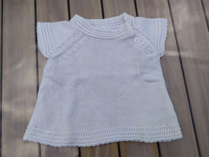Joli pull à manches courtes écru. Vertbaudet, taille 6 mois. Motif coeur devant, base large. Ouverture par 3 boutons devant qui partent du côté gauche vers le bras. Composition : 60% coton 40% acrylique. Pull en excellent état, comme neuf. #nerimafille6mois #vertbaudet