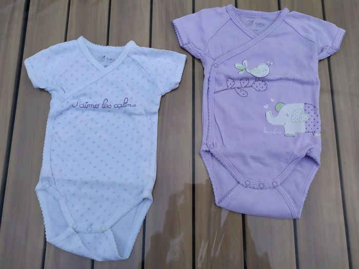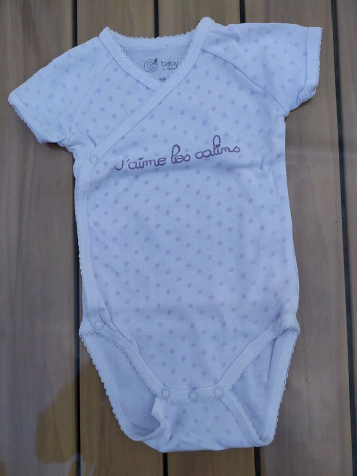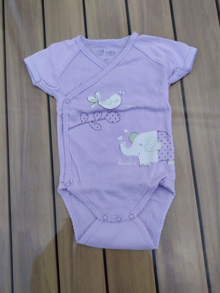 Lot de 2 bodies à manches courtes. Gémo, taille 6 mois. Ouverture par le devant. Composition : 100% coton ✔ blanc à pois lilas, une petite phrase dessus : j'aime les câlins. ✔violet clair avec un motif oiseau + éléphant. 🚫 Pas de réduction supplémentaire sur ce lot. Les deux sont en excellent état. #nerimafille6mois #gemo
