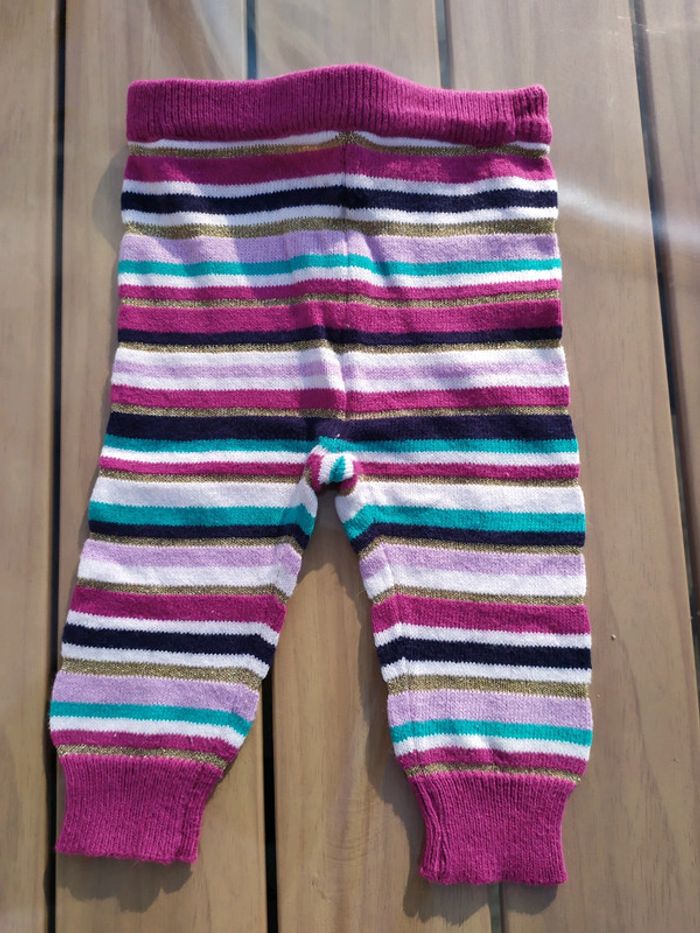 Joli legging violet à rayures multicolores. Kitchoun, taille 3 mois. Taille élastique, resserré au bas des jambes. Legging en excellent état. Vous trouverez plein d'autres articles dès la naissance sur #nerimabébé #nerimafille3mois