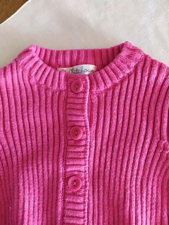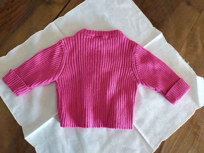 Gilet fushia épais. Kitchoun, taille 1 mois. Ferme sur le devant par 5 boutons. Il y a un revers cousu au bout des manches. Composition : 93% coton 7% polyamide. Gilet en excellent état. Vous trouverez plein d'autres articles dès la naissance sur #nerimabébé #nerimanaissance #nerimafille1mois