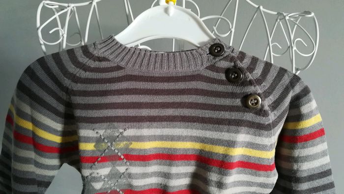 Pull gris à fines rayures. Col rond avec 3 boutons. Très bon état, taille 18 mois. Et plein d'autres vêtements en 18 mois sur #nerimavêtementsenfantgarçon18mois #nerimagarcon18mois
