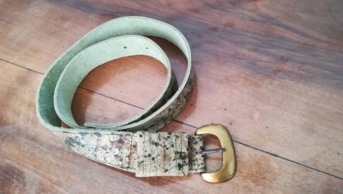 Ceinture de couleur vert clair avec des motifs effet tâches d'encres vert foncé et marron. Dimensions : longueur 80 cm. Largeur 2,5 cm. Ceinture en très bon état. Encore plus de ceintures femme sur : #nerimaceinturefemme