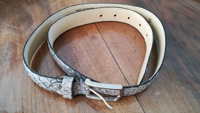 Ceinture en cuir de poisson grise. Dimensions : longueur 85 cm. Largeur 2,8 cm. Ceinture en très bon état. Encore plus de ceintures femme sur : #nerimaceinturefemme.
