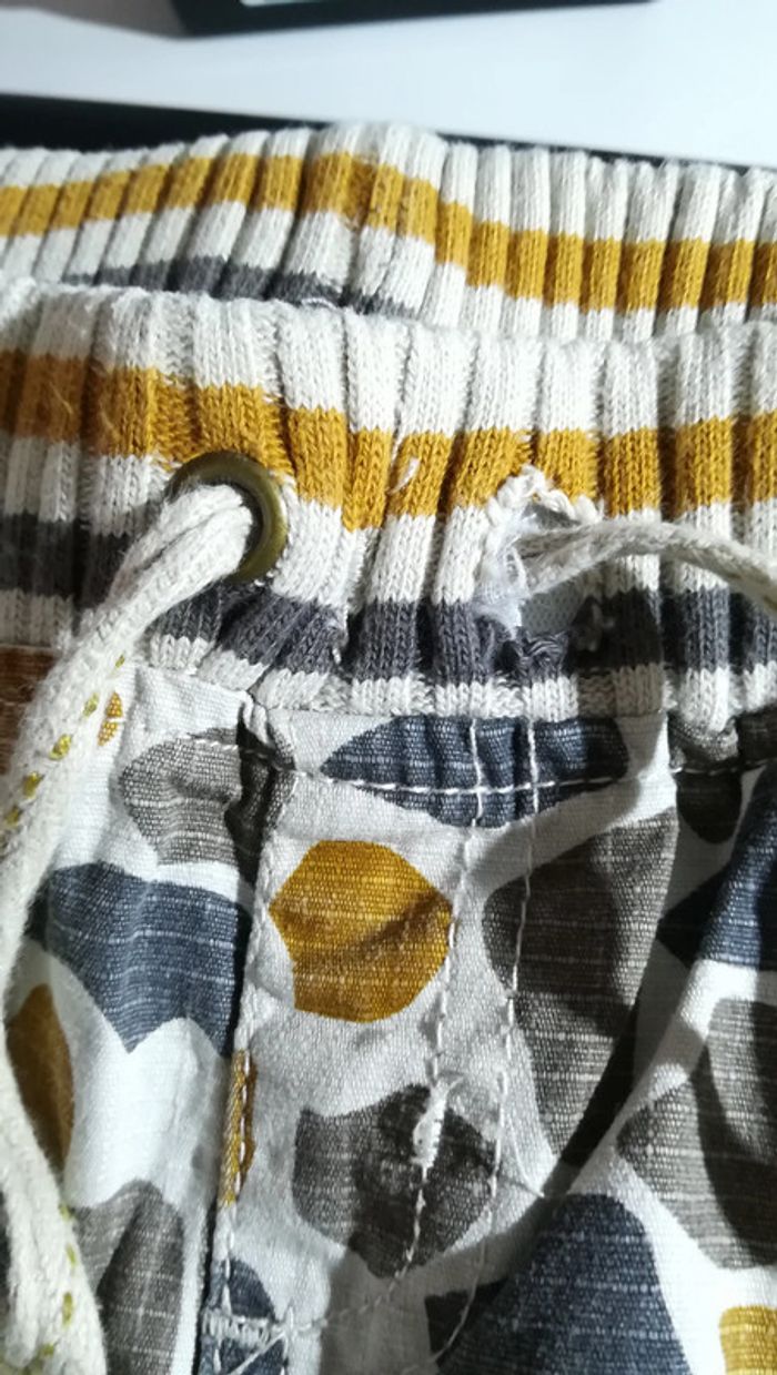 Bermuda beige à motifs marron, orange et gris anthracite. Taille élastique, 5 ans. Il manque un œillet ( cf photo 3). Et plein d'autres vêtements en 5 ans sur #nerimavêtementsenfantgarçon5ans