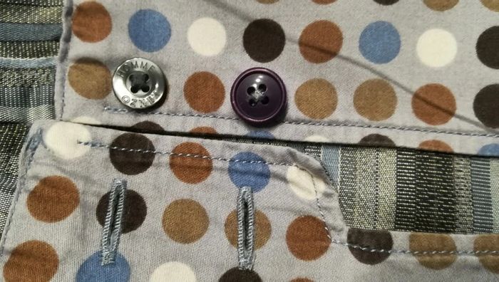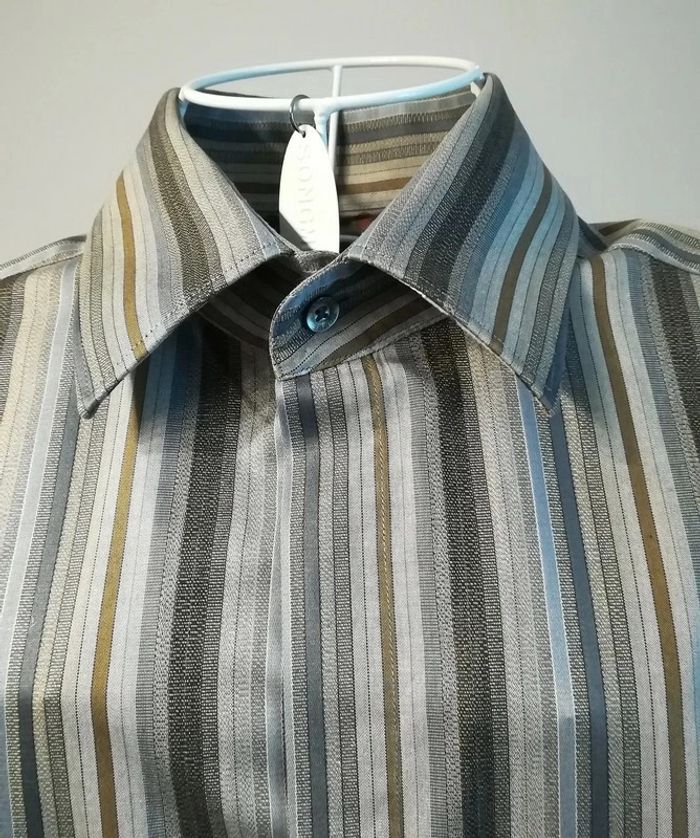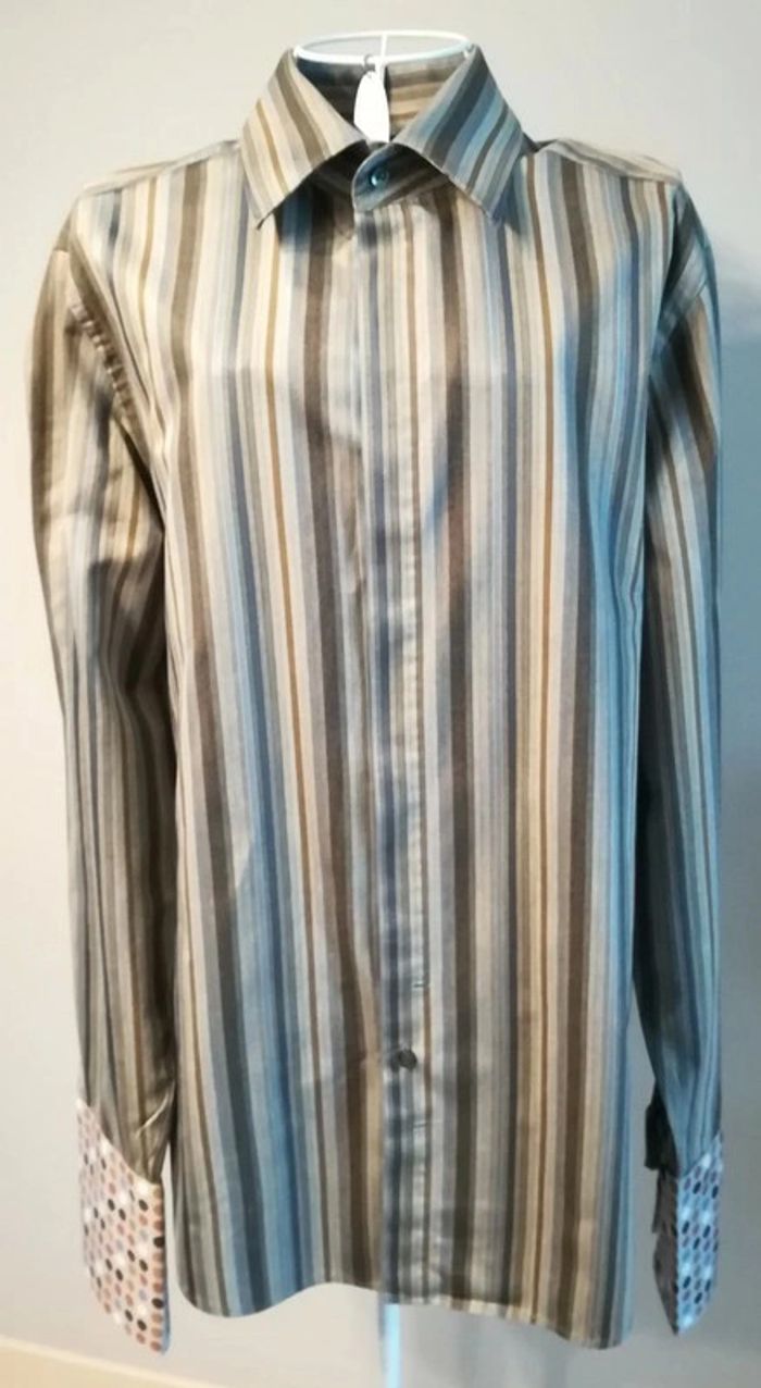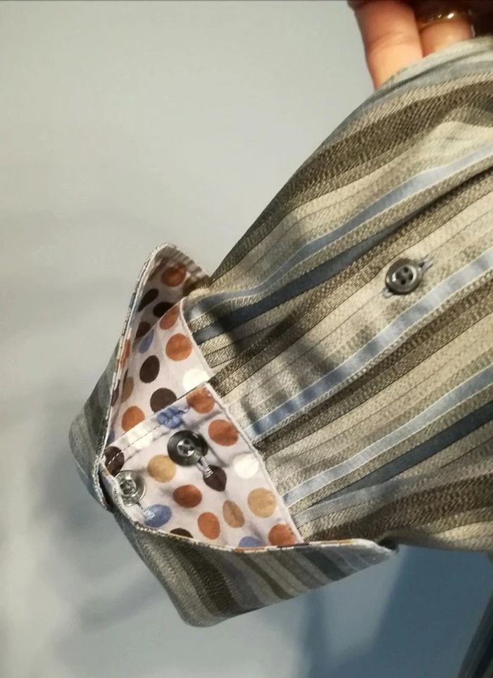 Chemise gris argent, à rayures bleues et marron. Taille 39. 15 1/2, 100% coton. Boutons cachés, originalité en bout de manches. Un bouton remplacé en sur la manche gauche ( cf photo 5). #nerimavêtementshomme #nerimahommem #kenzo