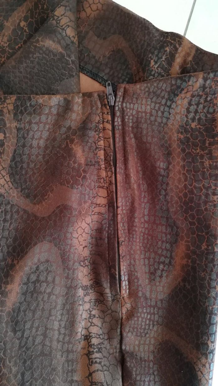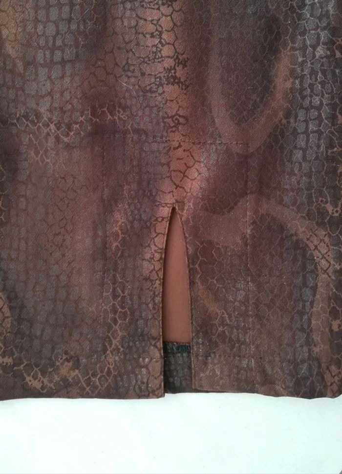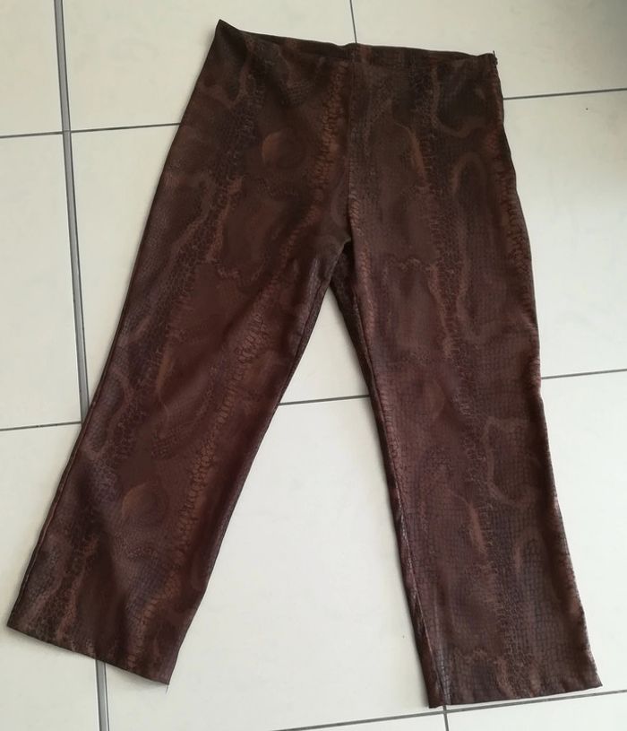 Pantalon marron effet peau de serpent. Fermeture zippée sur le côté. Petites fentes à l'arrière en bas des jambes. Longueur à partir de l'entrejambe : 60 cm. Modèle déposé. Taille 3 ET plein d'autres vêtements femme sur #nerimavêtementsfemme #nerimafemme40 #spatiale