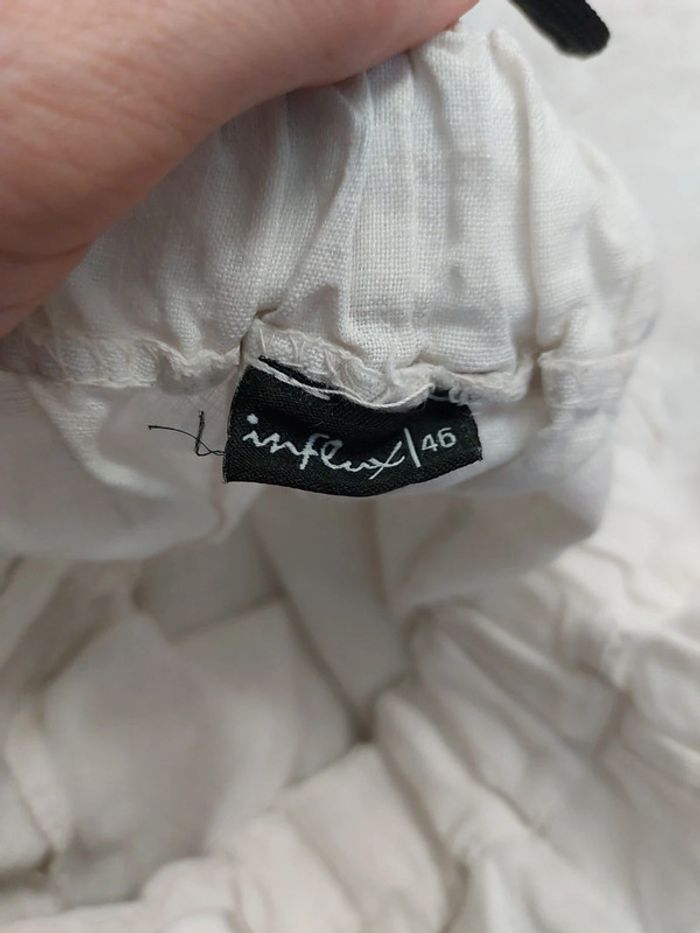 Pantalon fluide blanc légèrement transparent Taille 46 Largeur 40 cms Hauteur 102 cms Hauteur jambes à partir de l entrejambe 73 cms
