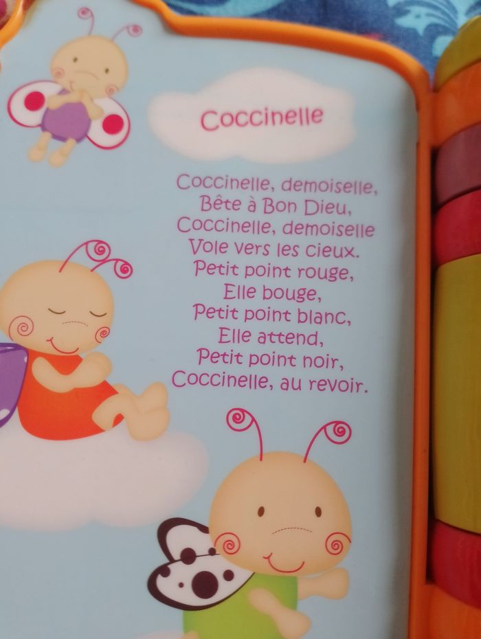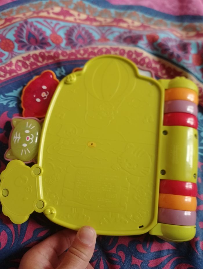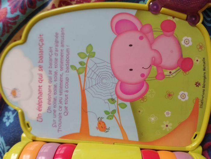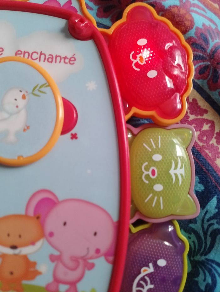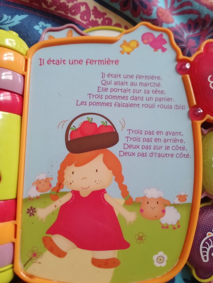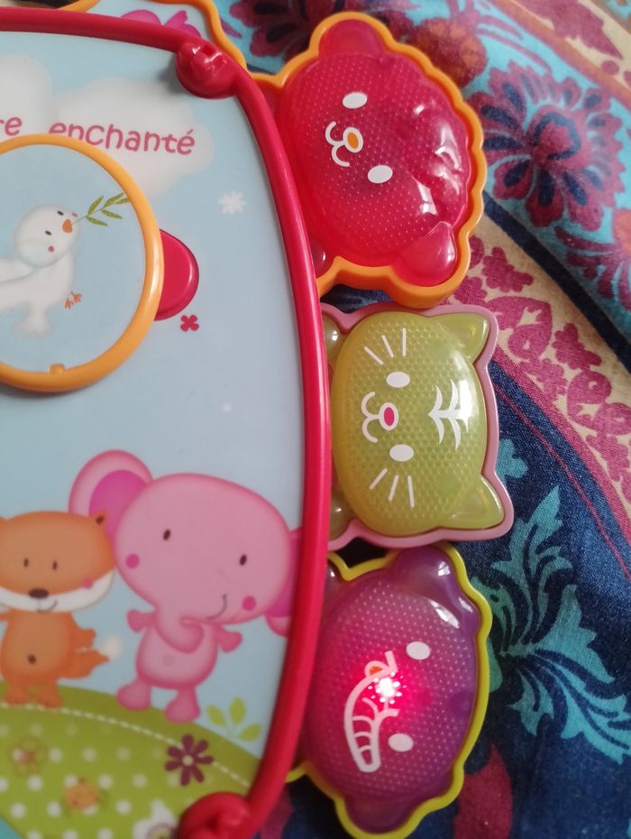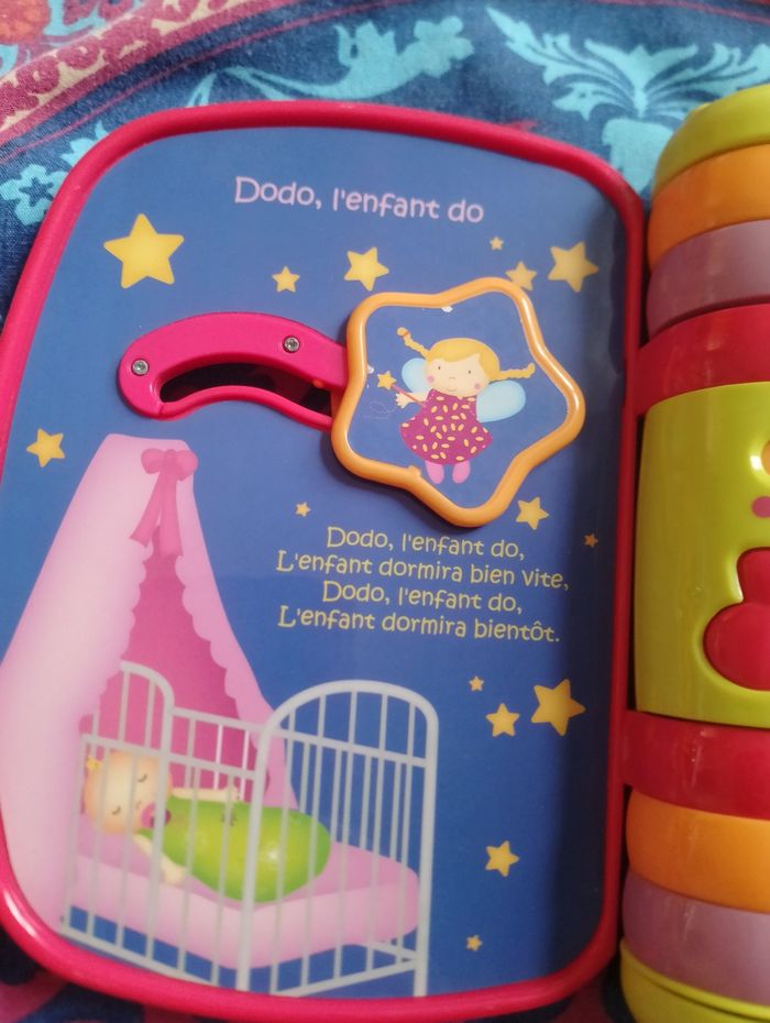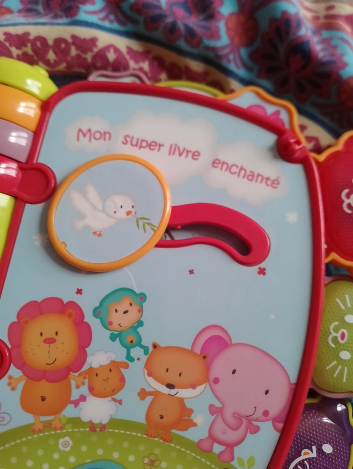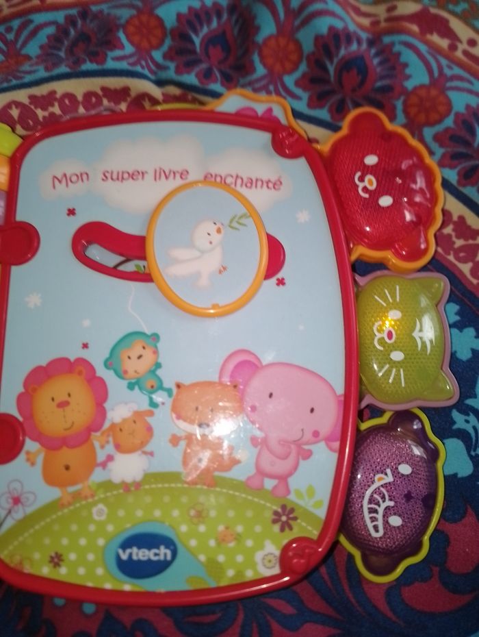 Mon super livre enchanté VTech animaux Livre interactif pour écouter des comptines célèbres en compagnie d’animaux rigolos. 7 petites comptines célèbres: « il était un petit navire », « ainsi font font font les petites marionnettes ». 3 grosses touches lumineuses en forme d’animaux clignotent au rythme des comptines. Quand Bébé appuie sur les animaux, il déclenche leur cri et des comptines. Des objets en relief à manipuler pour déclencher des chansons, les aires des mélodies seules (pour inciter Bébé et maman à chanter ensemble). Des petites questions incitent Bébé à découvrir toutes les comptines du livre. Age : 6 - 36 mois