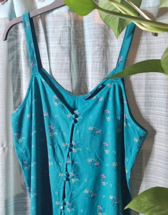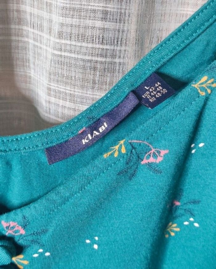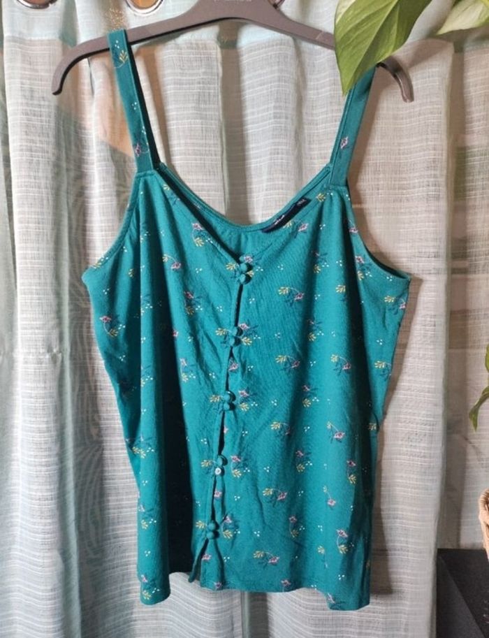 Débardeur vert a motifs de chez kiabi en taille 42/44 En parfaite état sauf un bouton a perdu son capuchon mais ne gêne en rien c'est seulement esthétique. Très peu porter