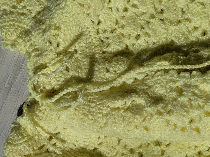 années 60 / 70 en excellent état en acrylique jaune motif ajouré manche longue ballon coupe évasée fermeture par nœud au col