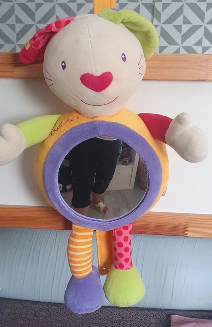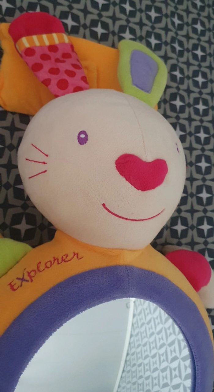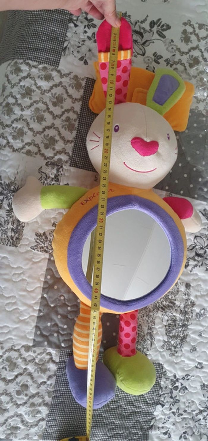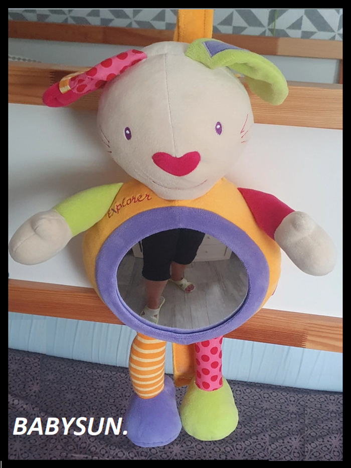 Peluche lapin Babysun avec miroir rond . Poids pour l'accrocher au lit qui s'enlève ou languette scratch pour l'accrocher au barrots du lit. Miroir démontable pour pouvoir laver la peluche en machine. Elle est en super état. Hauteur 63 cm environ. Norme CE.