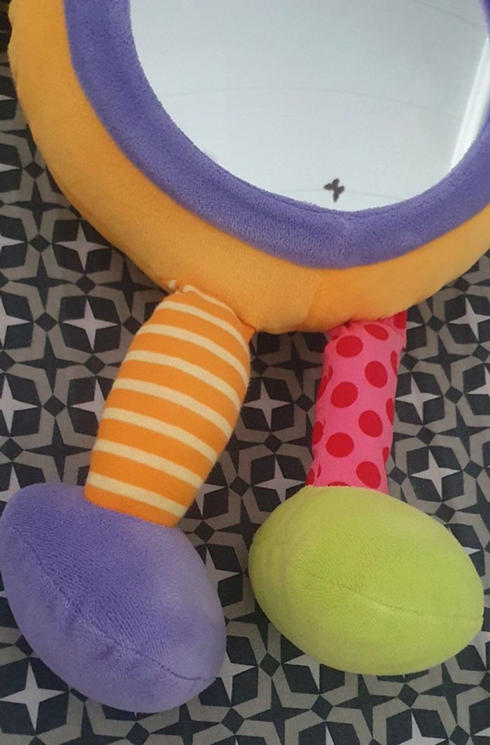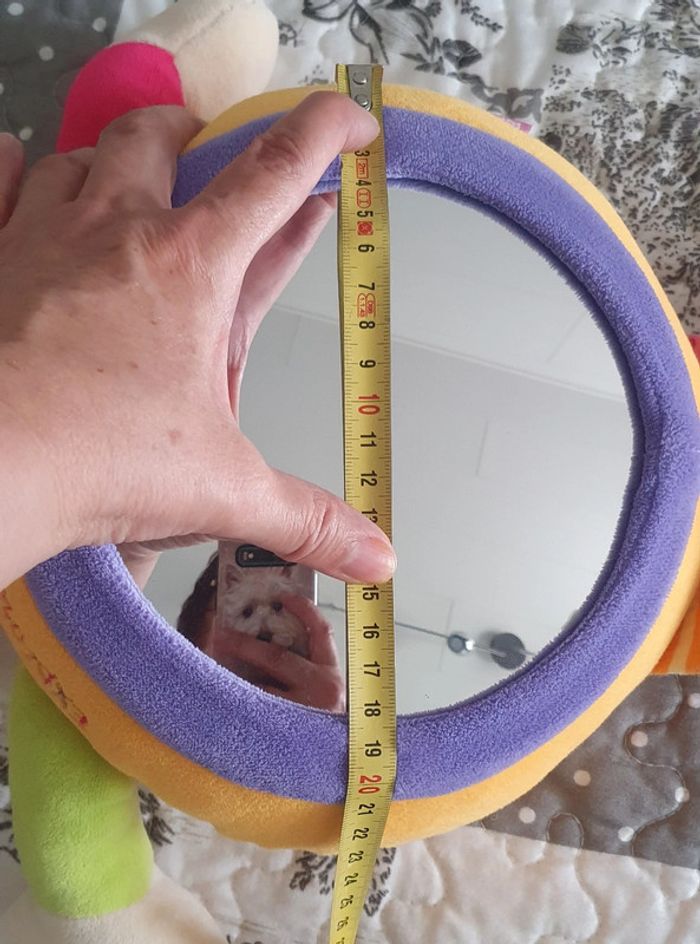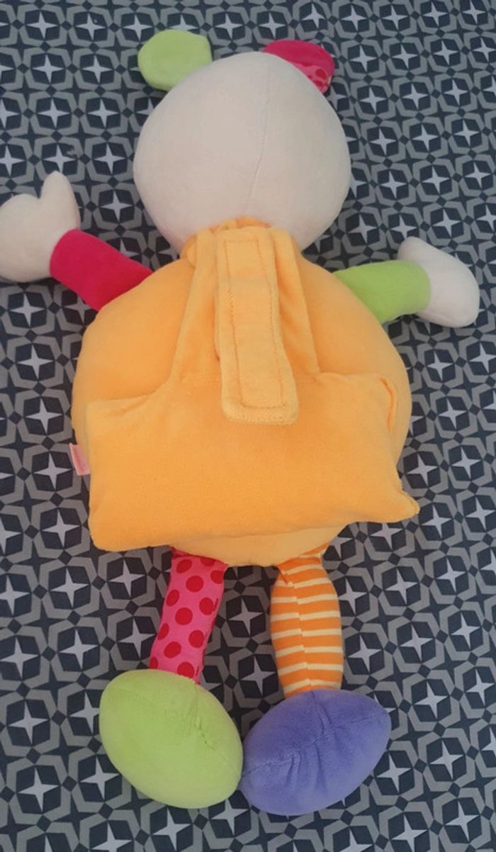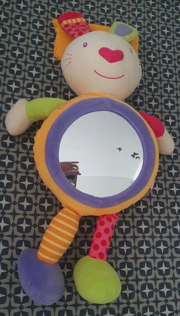 Peluche lapin Babysun avec miroir rond . Poids pour l'accrocher au lit qui s'enlève ou languette scratch pour l'accrocher au barrots du lit. Miroir démontable pour pouvoir laver la peluche en machine. Elle est en super état. Hauteur 63 cm environ. Norme CE.