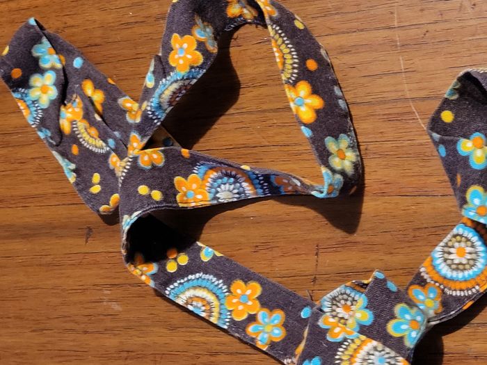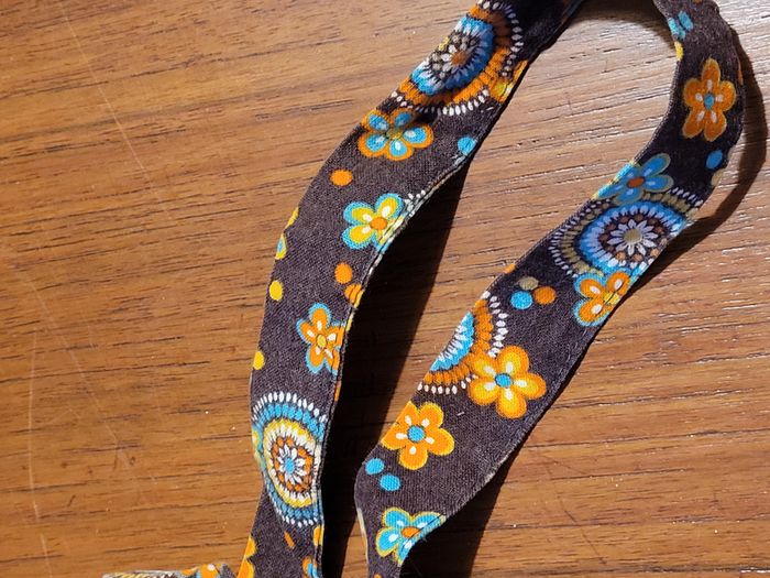 années 60 / 70 ceinture à nouer en coton motifs : fleurs orange et bleues sur fond marron largeur 2 cm longueur 150 cm