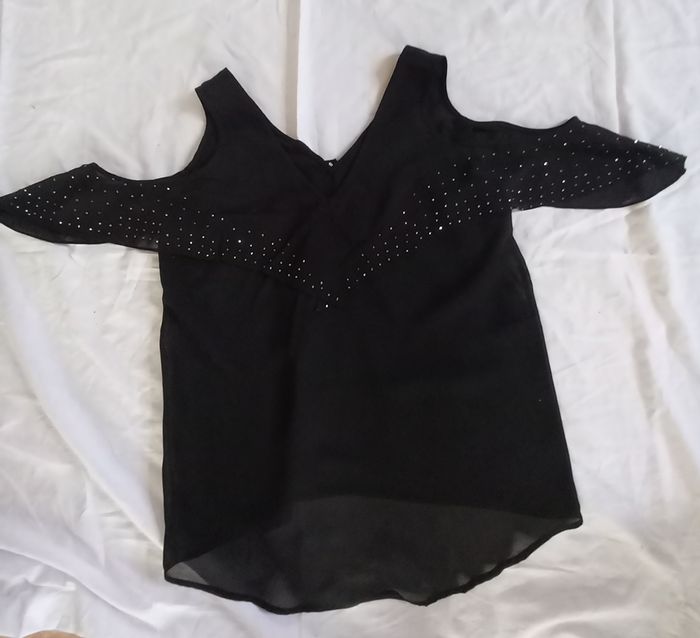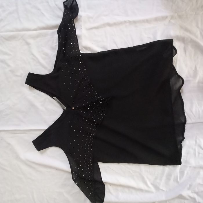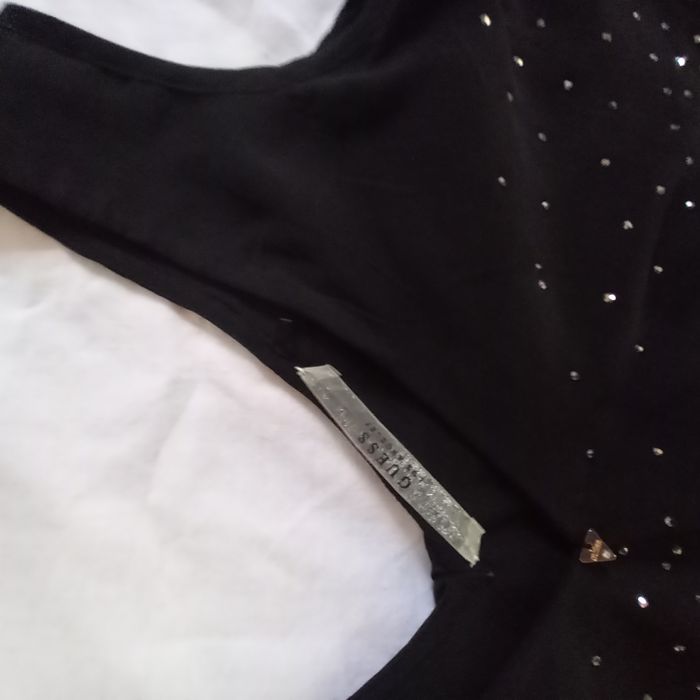 - Top Guess, Volant sur les épaules, effet en transparence, coloris noir, petits brillants, logo de la marque Guess Los Angeles sur étiquette et sur le volant (voir photos), bas arrondi, col en V, largeur épaules 38 cm - aisselles 50 cm, Longueur épaule-bas 64 cm- aisselles-bas 43 cm
