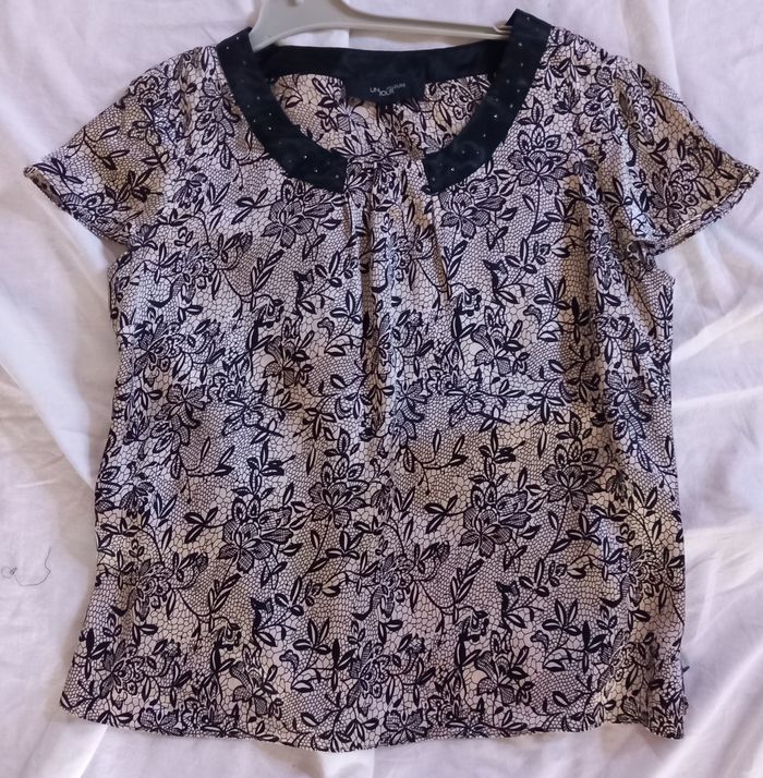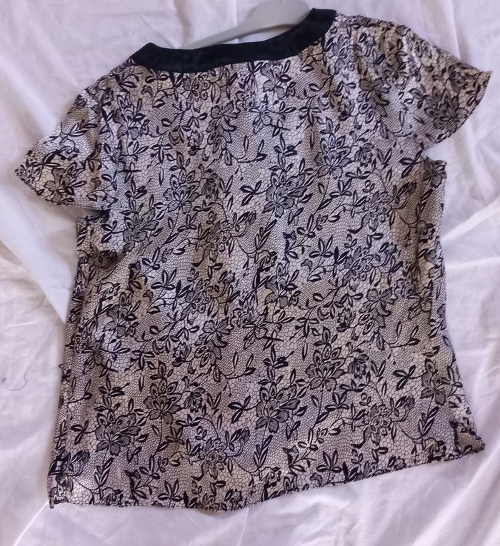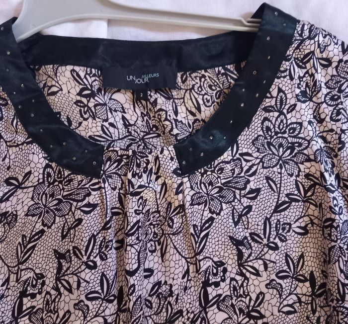 - Top Un jour Ailleurs, manches courtes, Zip latéral, à enfiler, col rond avec brillants, bas arrondi, tissu imprimé dentelle, coloris beige poudré et noir, 100% soie, doublure au col 100% polyester, Taille 2, largeur épaules 40 cm - aisselles 53 cm, Longueur épaule-bas 54 cm- aisselles-bas 35 cm