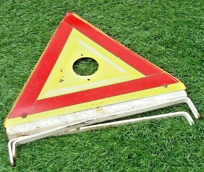 (article vendu en l' état, état d' usage voir toutes les photos) Ancien triangle de signalisation pour automobile. Métal Agrée IP-PS-37l (340x340x340)mm Poids : 1kg150