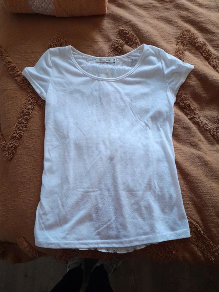 Tee-shirt manches courtes blanc avec zip dans le dos et dentelle taille s/m légèrement boulocher